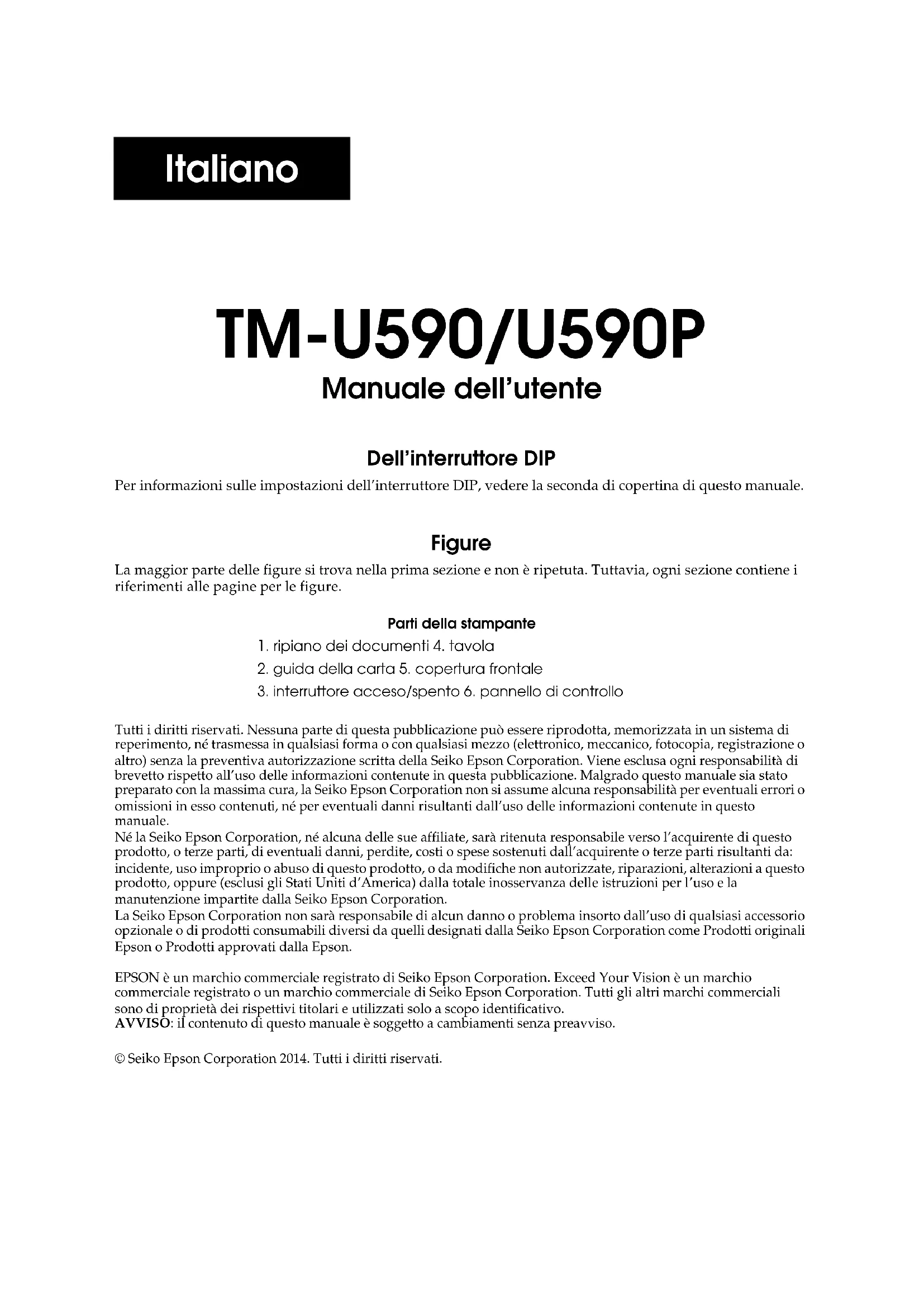 + 24 V d.c. ± 10 % Stroomverbruik (bij 24 V) Bedrijf: gemiddeld: ong. 1,9 A, piek: ong. 8 A Stand-by: gemiddeld: ong. 0,3 A MTBF 180 000 uur MCBF 29 miljoen regels Temperatuur Bedrijf: 5 tot 45 °C Opslag: -10 tot 50 °C (m.u.v. papier) Vochtigheid Bedrijf: 10-90 % relatieve vochtigheid Opslag: 10-90 % relatieve vochtigheid, m.u.v. papier Afmetingen 185 × 252 × 266 mm (inclusief documenttafel) (H × B × D) Gewicht (massa) Ongeveer 5 kg32 TM-U590/U590P Manuale dell’utente Italiano TM-U590/U590P Manuale dell’utente Dell’interruttore DIP Per informazioni sulle impostazioni dell’interruttore DIP, vedere la seconda di copertina di questo manuale. Figure La maggior parte delle figure si trova nella prima sezione e non è ripetuta. Tuttavia, ogni sezione contiene i riferimenti alle pagine per le figure. Tutti i diritti riservati. Nessuna parte di questa pubblicazione può essere riprodotta, memorizzata in un sistema di reperimento, né trasmessa in qualsiasi forma o con qualsiasi mezzo (elettronico, meccanico, fotocopia, registrazione o altro) senza la preventiva autorizzazione scritta della Seiko Epson Corporation. Viene esclusa ogni responsabilità di brevetto rispetto all’uso delle informazioni contenute in questa pubblicazione. Malgrado questo manuale sia stato preparato con la massima cura, la Seiko Epson Corporation non si assume alcuna responsabilità per eventuali errori o omissioni in esso contenuti, né per eventuali danni risultanti dall’uso delle informazioni contenute in questo manuale. Né la Seiko Epson Corporation, né alcuna delle sue affiliate, sarà ritenuta responsabile verso l’acquirente di questo prodotto, o terze parti, di eventuali danni, perdite, costi o spese sostenuti dall’acquirente o terze parti risultanti da: incidente, uso improprio o abuso di questo prodotto, o da modifiche non autorizzate, riparazioni, alterazioni a questo prodotto, oppure (esclusi gli Stati Uniti d’America) dalla totale inosservanza delle istruzioni per l’uso e la manutenzione impartite dalla Seiko Epson Corporation. La Seiko Epson Corporation non sarà responsabile di alcun danno o problema insorto dall’uso di qualsiasi accessorio opzionale o di prodotti consumabili diversi da quelli designati dalla Seiko Epson Corporation come Prodotti originali Epson o Prodotti approvati dalla Epson. EPSON è un marchio commerciale registrato di Seiko Epson Corporation. Exceed Your Vision è un marchio commerciale registrato o un marchio commerciale di Seiko Epson Corporation. Tutti gli altri marchi commerciali sono di proprietà dei rispettivi titolari e utilizzati solo a scopo identificativo.AVVISO: il contenuto di questo manuale è soggetto a cambiamenti senza preavviso.© Seiko Epson Corporation 2014. Tutti i diritti riservati.Parti della stampante1. ripiano dei documenti 4. tavola2. guida della carta 5. copertura frontale3. interruttore acceso/spento 6. pannello di controllo ItalianoTM-U590/U590P Manuale dell’utente 33 Italiano Precauzioni di sicurezza Questa sezione contiene informazioni importanti per l’uso efficiente e sicuro di questo prodotto. Leggere attentamente questa sezione e conservarla in un luogo prontamente accessibile. AVVERTENZA: Spegnere immediatamente l’unità se produce fumo, un odore strano o un rumore inconsueto. L’uso continuato potrebbe costituire causa d’incendio. Staccare immediatamente la spina dell’unità e rivolgersi al rivenditore o alla Seiko Epson per assistenza in merito. Non riparare mai da soli questa unità. La riparazione impropria potrebbe creare un pericolo. Non smontare né modificare mai questo prodotto. La manomissione del prodotto potrebbe causare lesioni personali, incendio. Accertarsi di usare la fonte di alimentazione specificata. Il collegamento del prodotto ad una fonte di alimentazione impropria potrebbe causare incendio. Evitare che nell’unità entrino corpi estranei. Questi potrebbero causare incendio. Se acqua o altri liquidi cadono accidentalmente nell’unità, staccare immediatamente il cavo di alimentazione, quindi rivolgersi per consigli al rivenditore o al centro di assistenza della Seiko Epson. L’uso continuato dell’unità potrebbe causare incendio. Per evitare il pericolo d'incendio, non usare spruzzatori aerosol contenenti gas infiammabili, all'interno del prodotto o vicino ad esso. ATTENZIONE: Non collegare i cavi in alcun modo diverso da quello indicato in questo manuale. Collegamenti non corretti possono causare danni all’unità e ustioni personali. Posare questa unità su una superficie piana, solida e stabile. Se cade, questa unità può rompersi o causare lesioni personali. Non usare questa unità in ambienti soggetti ad un elevato tasso di umidità o polvere. L’umidità o la polvere eccessiva può causare danni all’unità o incendio. Non mettere oggetti pesanti sopra questa unità. Non porsi sopra questa unità né appoggiarsi. L’unità potrebbe cadere e rompersi o causare lesioni personali. Per motivi di sicurezza, staccare sempre la spina dell’unità prima di lasciarla incustodita per un lungo periodo di tempo.34 TM-U590/U590P Manuale dell’utente Italiano Etichette di avvertimento Le etichette di avvertimento presenti sul prodotto indicano le seguenti precauzioni. AVVERTENZA: Non collegare una linea telefonica al connettore del cassetto estraibile o al connettore del modulo display, altrimenti la stampante e la linea telefonica possono danneggiarsi. ATTENZIONE: Durante o dopo la stampa, la testina di stampa può essere molto calda. Limitazioni d’impiego Quando questo prodotto viene impiegato in applicazioni che richiedono un alto grado di affidabilità e sicurezza, come dispositivi relativi a trasporti aerei, per treno, via mare, con motoveicoli, ecc., dispositivi per la prevenzione di disastri, dispositivi di sicurezza vari ecc. o dispositivi di precisione/funzionali, lo si dovrebbe usare solo dopo avere preso in considerazione l’inclusione nel progetto di elementi di ridonda