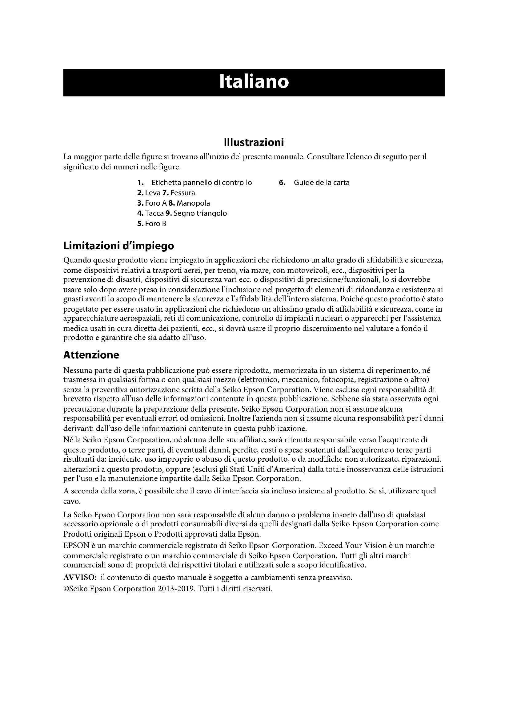 DC + 24 V ± 7% Stroomverbruik Ongeveer 1,8 A Temperatuur/ Vochtigheid Thermisch papier In bedrijf: 5 tot 45 °C, 10 tot 90% RV Opslag: –10 tot 50 °C, 10 tot 90% RV (met uitzondering van papier) Voeringloos etikettenpapier In bedrijf: 5 tot 35 °C, 20 tot 80% RV Opslag: –10 tot 50 °C, 10 tot 90% RV (met uitzondering van papier) Vochtigheid 10 tot 90% Algemene afmetingen 140 × 203 × 148 mm (B × D × H) Gewicht (massa) Ongeveer 1,9 kgItaliano Illustrazioni La maggior parte delle figure si trovano all'inizio del presente manuale. Consultare l'elenco di seguito per il significato dei numeri nelle figure. Limitazioni d’impiego Quando questo prodotto viene impiegato in applicazioni che richiedono un alto grado di affidabilità e sicurezza, come dispositivi relativi a trasporti aerei, per treno, via mare, con motoveicoli, ecc., dispositivi per la prevenzione di disastri, dispositivi di sicurezza vari ecc. o dispositivi di precisione/funzionali, lo si dovrebbe usare solo dopo avere preso in considerazione l’inclusione nel progetto di elementi di ridondanza e resistenza ai guasti aventi lo scopo di mantenere la sicurezza e l’affidabilità dell’intero sistema. Poiché questo prodotto è stato progettato per essere usato in applicazioni che richiedono un altissimo grado di affidabilità e sicurezza, come in apparecchiature aerospaziali, reti di comunicazione, controllo di impianti nucleari o apparecchi per l’assistenza medica usati in cura diretta dei pazienti, ecc., si dovrà usare il proprio discernimento nel valutare a fondo il prodotto e garantire che sia adatto all’uso. Attenzione Nessuna parte di questa pubblicazione può essere riprodotta, memorizzata in un sistema di reperimento, né trasmessa in qualsiasi forma o con qualsiasi mezzo (elettronico, meccanico, fotocopia, registrazione o altro) senza la preventiva autorizzazione scritta della Seiko Epson Corporation. Viene esclusa ogni responsabilità di brevetto rispetto all’uso delle informazioni contenute in questa pubblicazione. Sebbene sia stata osservata ogni precauzione durante la preparazione della presente, Seiko Epson Corporation non si assume alcuna responsabilità per eventuali errori od omissioni. Inoltre l'azienda non si assume alcuna responsabilità per i danni derivanti dall'uso delle informazioni contenute in questa pubblicazione. Né la Seiko Epson Corporation, né alcuna delle sue affiliate, sarà ritenuta responsabile verso l’acquirente di questo prodotto, o terze parti, di eventuali danni, perdite, costi o spese sostenuti dall’acquirente o terze parti risultanti da: incidente, uso improprio o abuso di questo prodotto, o da modifiche non autorizzate, riparazioni, alterazioni a questo prodotto, oppure (esclusi gli Stati Uniti d’America) dalla totale inosservanza delle istruzioni per l’uso e la manutenzione impartite dalla Seiko Epson Corporation. A seconda della zona, è possibile che il cavo di interfaccia sia incluso insieme al prodotto. Se sì, utilizzare quel cavo. La Seiko Epson Corporation non sarà responsabile di alcun danno o problema insorto dall’uso di qualsiasi accessorio opzionale o di prodotti consumabili diversi da quelli designati dalla Seiko Epson Corporation come Prodotti originali Epson o Prodotti approvati dalla Epson. EPSON è un marchio commerciale registrato di Seiko Epson Corporation. Exceed Your Vision è un marchio commerciale registrato o un marchio commerciale di Seiko Epson Corporation. Tutti gli altri marchi commerciali sono di proprietà dei rispettivi titolari e utilizzati solo a scopo identificativo. AVVISO: il contenuto di questo manuale è soggetto a cambiamenti senza preavviso. ©Seiko Epson Corporation 2013-2019. Tutti i diritti riservati.