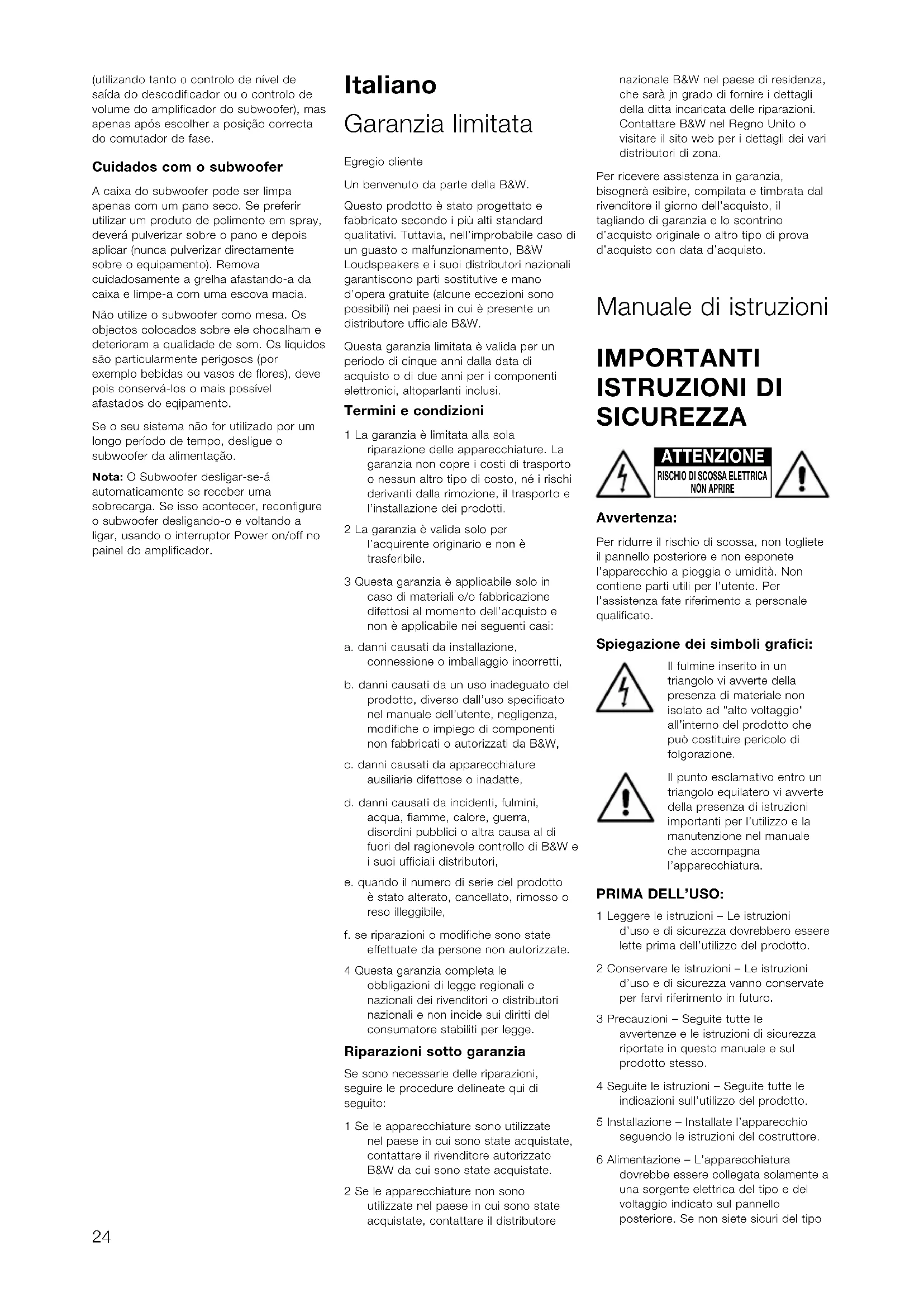 - Posizionate il commutatore di FASE inizialmente a 0°. Vedere anche la sezione “messa a punto”. Messa a punto Ci sono due regolazioni dell’interruttore EQ. La posizione B viene ottimizzata per consentire al subwoofer di fornire i più alti livelli di ascolto, mentre la posizione A offre una maggiore estensione sulle basse frequenze abbinata ad un suono più controllato. Audio a 2 canali Le regolazioni ottimali del commutatore di FASE e della frequenza del filtro PASSA – BASSO sono correlate e dipendono anche dalla caratteristica di taglio alle basse frequenze dei diffusori satellite e dalle relative posizioni di tutti i diffusori dell’impianto. Collocate il sistema nella posizione preferita ed ascoltate alcuni brani con un ricco contenuto di basse frequenze. La regolazione ottimale della FREQUENZA PASSA – BASSO dipende da diverse variabili – la risposta ai bassi e la potenza di pilotaggio dei diffusori satellite, il numero dei subwoofer utilizzati e la loro posizione rispetto ai diffusori. La gamma degli 80- 90Hz è un buon punto di partenza per il filtro PASSA – BASSO. A meno che non vengano utilizzati due subwoofer per garantire un’informazione musicale separata nei canali destro e sinistro, e questi sono collocati vicino ai diffusori principali, l’utilizzo di una frequenza di taglio più alta può alterare l’immagine stereo e dovrebbe essere presa in considerazione solo nel caso in cui la risposta sui bassi sei diffusori satellite fosse particolarmente limitata. Ad ogni regolazione della frequenza di taglio, ascoltate, con il commutatore di fase 27in entrambe le posizioni. Quella corretta vi darà il basso più corposo e questo dipenderà dalle caratteristiche di risposta alle basse frequenze dei vostri diffusori satellite e dalle relative distanze del/dei subwoofer e dei satelliti dall’ascoltatore. Quando utilizzate più di un subwoofer, assicuratevi che ognuno di essi abbia commutatori di fase e di frequenza di taglio nella stessa posizione. Regolate il loudness del subwoofer rispetto ai diffusori satellite a vostro piacimento. Usate un’ampia varietà di brani per trovare una regolazione ottimale. Se un pezzo musicale ad un livello di regolazione ha un suono eccezionale, un altro brano allo stesso livello di loudness può risultare eccessivamente potente. Ascoltate a livelli realistici poiché la percezione del bilanciamento varia in funzione del livello sonoro. Home Theater La situazione con l’home theater è in un certo senso diversa dall’audio a 2 canali. Il segnale del subwoofer (LFE) è un canale separato più che un’estensione del segnale ai diffusori satellite. Il filtro PASSA – BASSO viene disattivato perché il decoder fornisce tutti i filtri per qualsiasi diffusore posto su “small”. Tuttavia, la posizione dell’interruttore di fase deve ancora essere definita. Normalmente la fase sarà posta a 0°, ma se il subwoofer viene posto a una notevole distanza dagli altri diffusori, oppure l’amplificatore di potenza che pilota gli altri diffusori, inverte per caso il segnale, potrebbe essere consigliabile la posizione 180°. Ascoltate con l’interruttore in entrambe le posizioni e scegliete quello che fornisce il suono più pieno. In genere, i decoder hanno un segnale di test che può essere utilizzato per definire i livelli relativi ai tutti i diffusori, rendendo il compito in un certo senso più semplice che con l’audio a 2 canali. Tuttavia, fate attenzione durante la regolazione dei livelli. È fin troppo facile lasciarsi trasportare dalle possibilità del subwoofer, in particolar modo con alcuni effetti sulle basse frequenze. Spesso un’immagine più realistica e una più soddisfacente a lungo termine, è possibile ottenerla regolando il livello del subwoofer più basso del livello di calibrazione standard. Tutte le applicazioni Se avete problemi di bassi eccessivi- se alcune note basse sono esuberanti più di altre – probabilmente avete problemi di interfaccia con l’ambiente d’ascolto ed è consigliabile intervenire sul posizionamento del subwoofer. Quelli che possono sembrare piccoli spostamenti – circa 15 cm – possono avere effetti molto rilevanti sul suono. Provate ad alzare il subwoofer dal pavimento spostandolo anche dai lati. L’utilizzo di più subwoofer può attenuare gli effetti delle risonanze della stanza poiché ogni subwoofer tenderà a stimolare risonanze a frequenze diverse. Se modificate in modo considerevole le distanze fra i subwoofer e i diffusori satellite e gli ascoltatori, ridefinite la regolazione della fase. Dovreste anche verificare il livello del subwoofer (utilizzando sia i livelli di uscita dal decoder, sia il controllo volume sull’amplificatore del subwoofer in maniera adeguata) ma solo dopo aver regolato correttamente la fase. Manutenzione del subwoofer Il cabinet del subwoofer potrebbe essere pulito spolverandolo con un panno asciutto. Se desiderate utilizzare un prodotto spray per la pulizia, non spruzzatelo direttamente sul cabinet, ma sul panno. Rimuovete prima la griglia in modo tale che il tessuto non si macchi, facendo attenzione a non arrecare danno all’unità altoparlante. La griglia può essere pulita usando una spazzola morbida. Non usate il subwoofer come un tavolo. Quando è in funzione, gli oggetti lasciati sul piano superiore tendono a vibrare. In particolare, evitate il rischio che liquidi vengono versati (ad esempio bevande o vasi di fiori). Se il sistema non viene usato per parecchio tempo, scollegate il subwoofer dalla rete di alimentazione. Nota: il subwoofer si disattiva automaticamente se sovraccaricato. Se ciò accade, ressettate il subwoofer spegnendolo e poi riaccendendolo dall’interruttore on/off sul pannello dell’amplificatore. Nederlands Beperkte garantie Geachte cliënt, Welkom bij B&W. Dit product is volgens de hoogste kwaliteitsnormen ontworpen en vervaardigd. Mocht er toch iets defect zijn aan dit product dan kunt u aanspraak maken op gratis vervangi