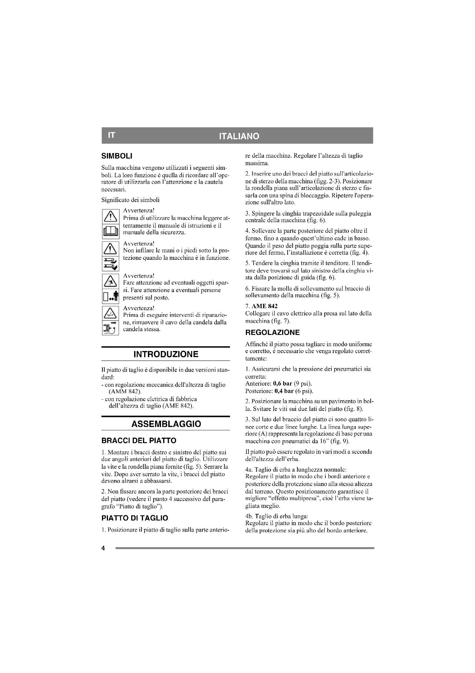 SIMBOLI Sulla macchina vengono utilizzati i seguenti sim- boli. La loro funzione è quella di ricordare all’ope- ratore di utilizzarla con l’attenzione e la cautela necessari. Significato dei simboli Avvertenza! Prima di utilizzare la macchina leggere at- tentamente il manuale di istruzioni e il manuale della sicurezza. Avvertenza! Non infilare le mani o i piedi sotto la pro- tezione quando la macchina è in funzione. Avvertenza! Fare attenzione ad eventuali oggetti spar- si. Fare attenzione a eventuali persone presenti sul posto. Avvertenza! Prima di eseguire interventi di riparazio- ne, rimuovere il cavo della candela dalla candela stessa. INTRODUZIONE Il piatto di taglio è disponibile in due versioni stan- dard: - con regolazione meccanica dell'altezza di taglio (AMM 842). - con regolazione elettrica di fabbrica dell’altezza di taglio (AME 842). ASSEMBLAGGIO