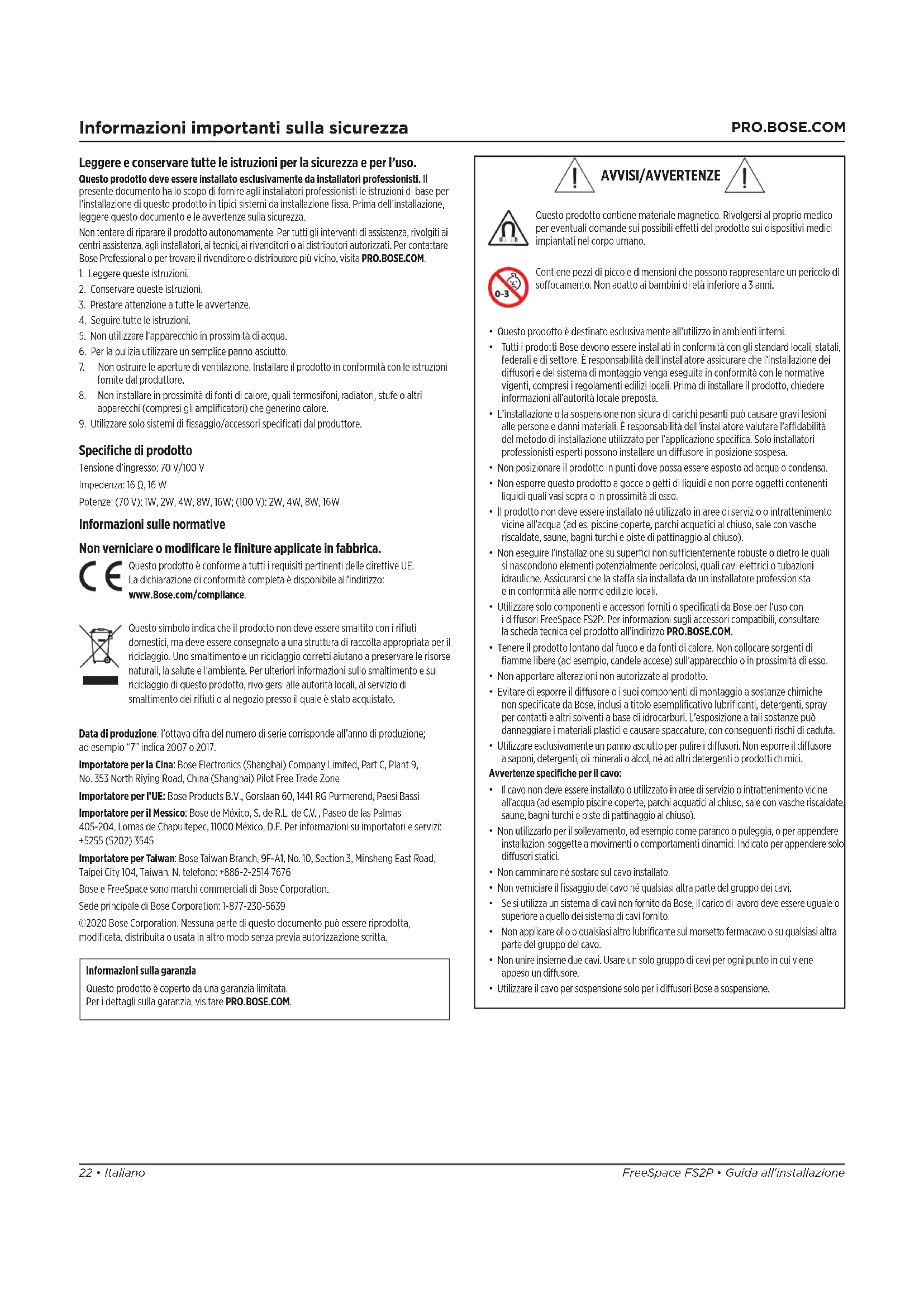 Informazioni importanti sulla sicurezza Leggere e conservare tutte le istruzioni per la sicurezza e per l’uso. Questo prodotto deve essere installato esclusivamente da installatori professionisti. Il presente documento ha lo scopo di fornire agli installatori professionisti le istruzioni di base per l’installazione di questo prodotto in tipici sistemi da installazione fissa. Prima dell’installazione, leggere questo documento e le avvertenze sulla sicurezza. Non tentare di riparare il prodotto autonomamente. Per tutti gli interventi di assistenza, rivolgiti ai centri assistenza, agli installatori, ai tecnici, ai rivenditori o ai distributori autorizzati. Per contattare Bose Professional o per trovare il rivenditore o distributore più vicino, visita PRO.BOSE.COM.