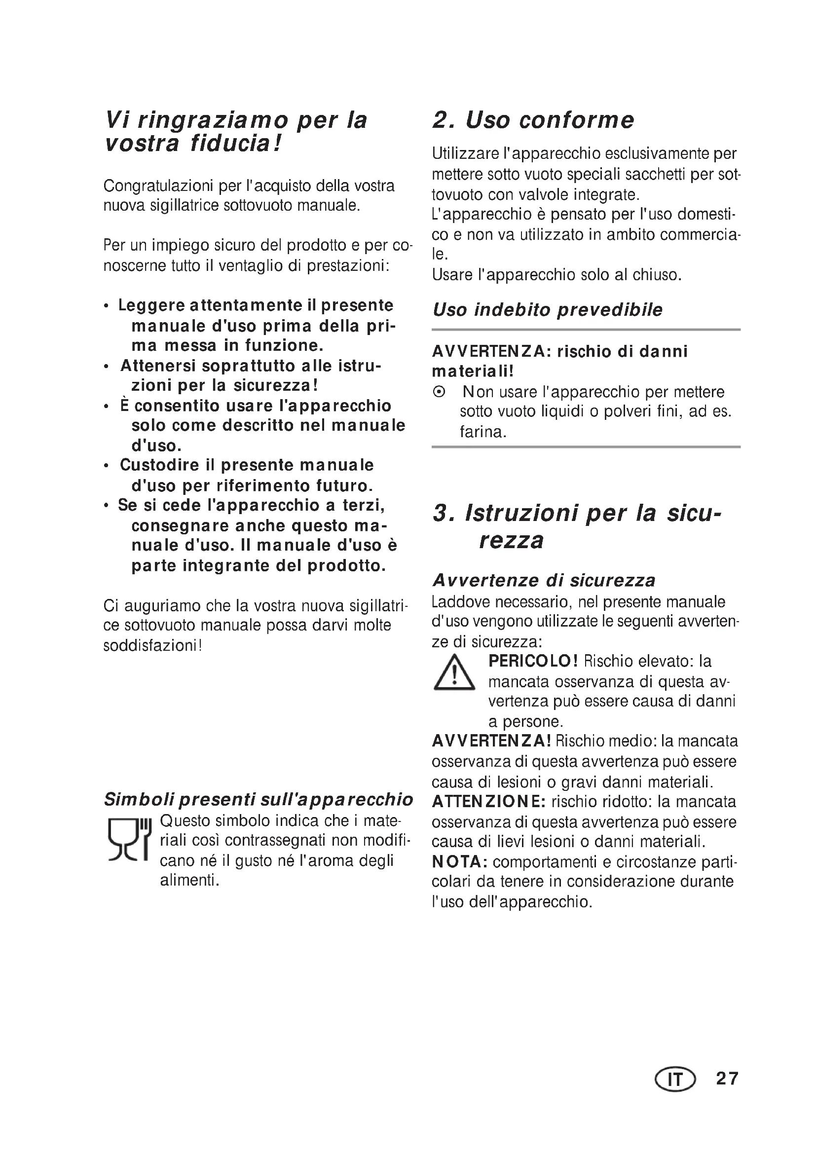 Vi ringraziamo per la vostra fiducia! Congratulazioni per l'acquisto della vostra nuova sigillatrice sottovuoto manuale. Per un impiego sicuro del prodotto e per co- noscerne tutto il ventaglio di prestazioni: