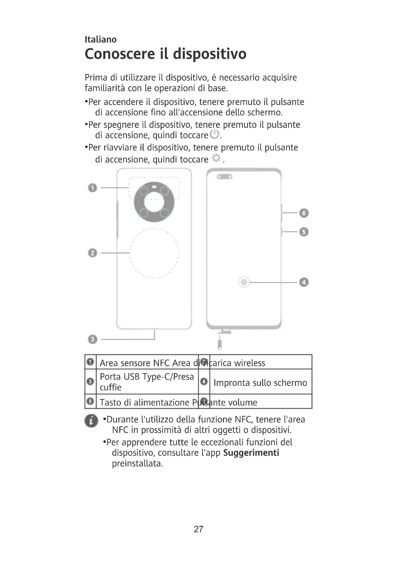 Area sensore NFC Area di ricarica wireless Porta USB Type-C/Presa cue Impronta sullo schermo Tasto di alimentazione Pulsante volume