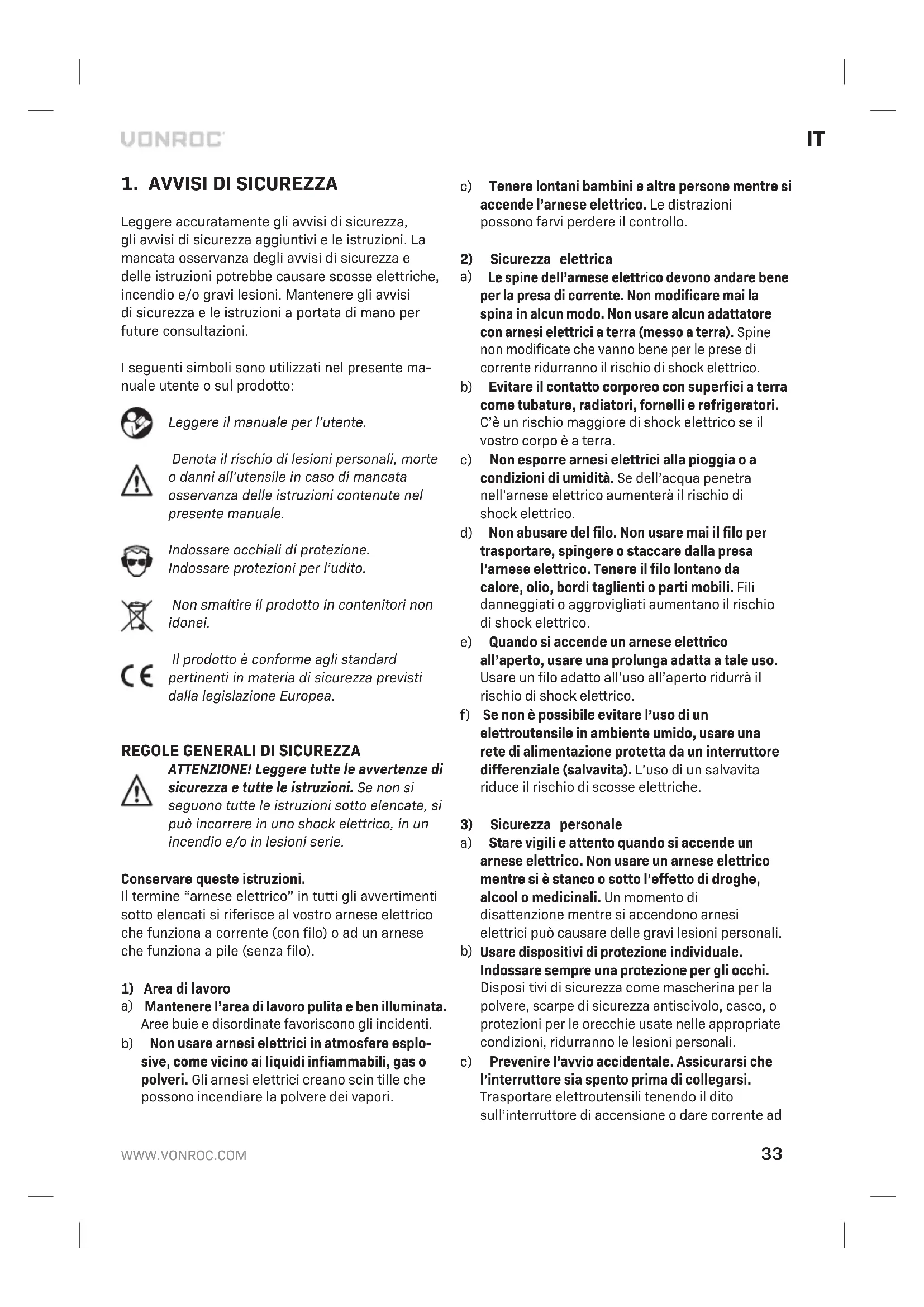 Sono state utilizzate parti di ricambio non originali Ciò costituisce l’unica garanzia espressa o implicita fornita dall’azienda. Non esistono altre garanzie espresse o implicite che si estendono oltre il presente documento, ivi comprese le garanzie im- plicite di commerciabilità e idoneità per uno scopo particolare. In nessun caso VONROC sarà responsa- bile di eventuali danni incidentali o consequenziali. I rimedi dei rivenditori saranno limitati alla ripara- zione o sostituzione di unità o parti non conformi. Il prodotto e il manuale per l’utente sono soggetti a modifi che. I dati tecnici possono essere modifi cati senza ulteriore notifi ca.