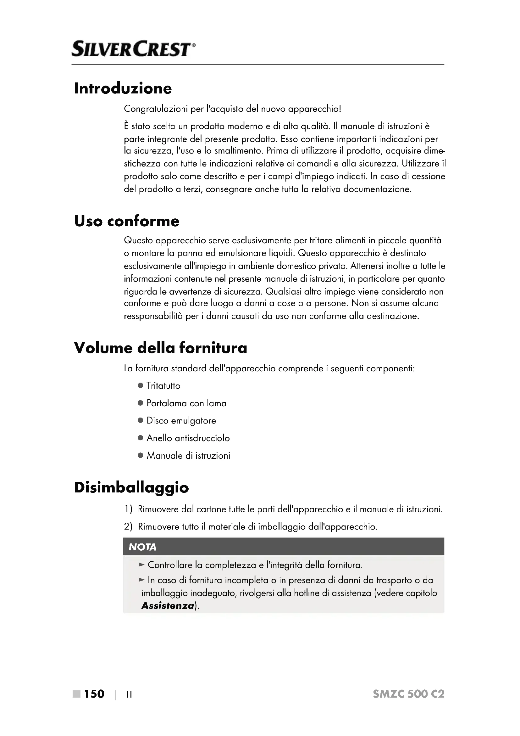 - Importatore Leggere con attenzione il manuale di istruzioni prima del primo utilizzo e conservarlo per l'uso successivo. In caso di cessione dell'apparecchio a terzi, consegnare anche le istruzioni.SMZC 500 C2 ■ 150 │ IT Introduzione Congratulazioni per l'acquisto del nuovo apparecchio! È stato scelto un prodotto moderno e di alta qualità. Il manuale di istruzioni è parte integrante del presente prodotto. Esso contiene importanti indicazioni per la sicurezza, l'uso e lo smaltimento. Prima di utilizzare il prodotto, acquisire dime- stichezza con tutte le indicazioni relative ai comandi e alla sicurezza. Utilizzare il prodotto solo come descritto e per i campi d'impiego indicati. In caso di cessione del prodotto a terzi, consegnare anche tutta la relativa documentazione. Uso conforme Questo apparecchio serve esclusivamente per tritare alimenti in piccole quantità o montare la panna ed emulsionare liquidi. Questo apparecchio è destinato esclusivamente all'impiego in ambiente domestico privato. Attenersi inoltre a tutte le informazioni contenute nel presente manuale di istruzioni, in particolare per quanto riguarda le avvertenze di sicurezza. Qualsiasi altro impiego viene considerato non conforme e può dare luogo a danni a cose o a persone. Non si assume alcuna ressponsabilità per i danni causati da uso non conforme alla destinazione. Volume della fornitura La fornitura standard dell'apparecchio comprende i seguenti componenti: ▯ Tritatutto ▯ Portalama con lama ▯ Disco emulgatore ▯ Anello antisdrucciolo ▯ Manuale di istruzioni Disimballaggio p. 163