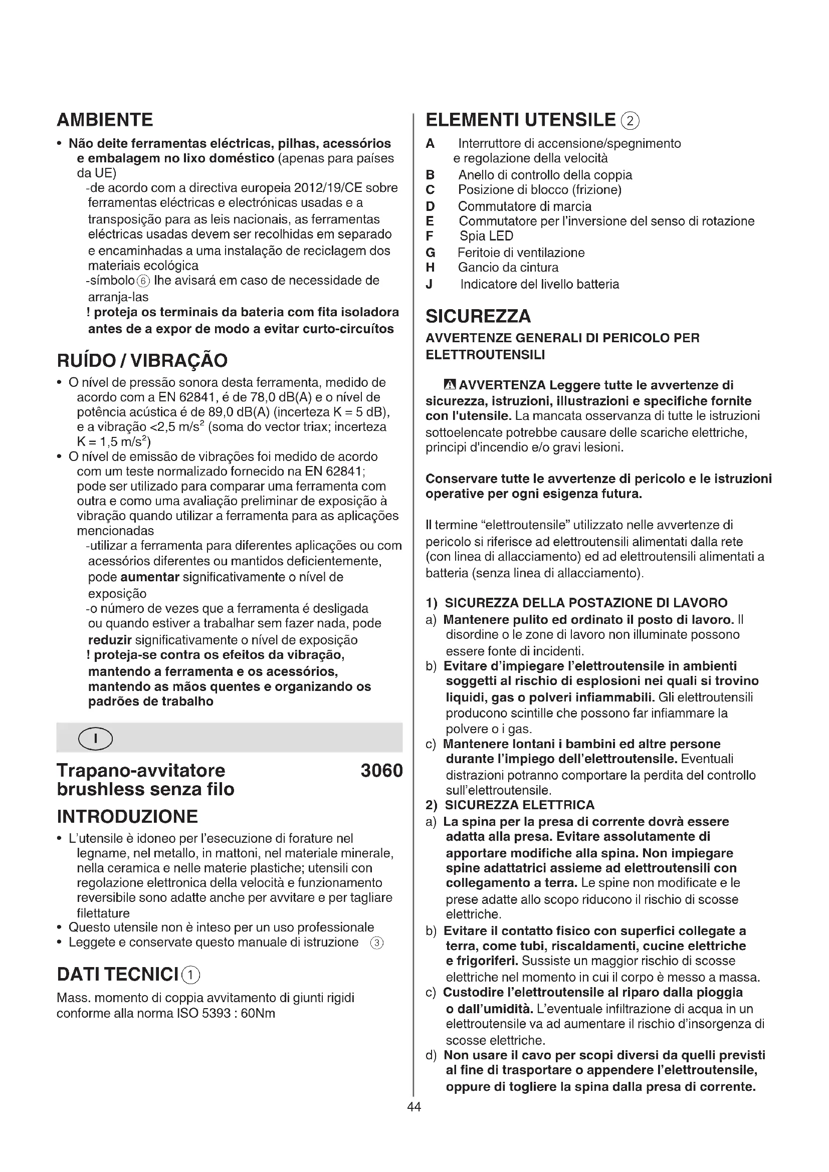 a) È importante concentrarsi su ciò che si sta facendo e a maneggiare con giudizio l’elettroutensile durante le operazioni di lavoro. Non utilizzare l’elettroutensile in caso di stanchezza o sotto l’eetto di droghe, bevande alcoliche e medicinali. Un attimo di distrazione durante l’uso dell’elettroutensile potrà causare lesioni gravi. b) Indossare sempre equipaggiamento protettivo individuale. Usare sempre protezioni per gli occhi. Se si avrà cura d’indossare equipaggiamento protettivo individuale come la maschera antipolvere, la calzatura antisdrucciolevole di sicurezza, il casco protettivo o la protezione dell’udito, a seconda dell’impiego previsto per l’elettroutensile, si potrà ridurre il rischio di ferite. c) Evitare l’accensione involontaria dell’elettroutensile. Prima di collegarlo alla rete di alimentazione elettrica e/o alla batteria ricaricabile, prima di prenderlo oppure prima di iniziare a trasportarlo, assicurarsi che l’elettroutensile sia spento. Tenendo il dito sopra l’interruttore mentre si trasporta l’elettroutensile oppure collegandolo all’alimentazione di corrente con l’interruttore inserito, si vengono a creare situazioni pericolose in cui possono vericarsi seri incidenti. d) Togliere gli attrezzi di regolazione o la chiave inglese prima di accendere l’elettroutensile. Un elettroutensile o una chiave inglese che si trovino in una parte dell’elettroutensile in rotazione potranno causare lesioni. e) È importante non sopravvalutarsi. Avere cura di mettersi in posizione sicura e di mantenere l’equilibrio. In tale maniera sarà possibile controllare meglio l’elettroutensile in situazioni inaspettate. f) Indossare vestiti adeguati. Evitare di indossare vestiti lenti o gioielli. Tenere capelli e vestiti lontani da parti in movimento. Vestiti lenti, gioielli o capelli lunghi potranno impigliarsi in pezzi in movimento. g) Se sussiste la possibilità di montare dispositivi di aspirazione o di captazione della polvere, assicurarsi che gli stessi siano stati installati correttamente e vengano utilizzati senza errori. L’utilizzo di un’aspirazione polvere può ridurre lo svilupparsi di situazioni pericolose dovute alla polvere. h) Una volta presa condenza con gli utensili, evitare di trascurare le norme di sicurezza. Una mancanza di attenzione può causare gravi lesioni in una frazione di secondo.46 punte possono piegarsi e causare rotture o perdita di controllo, con conseguenti lesioni. NOTE GENERALI