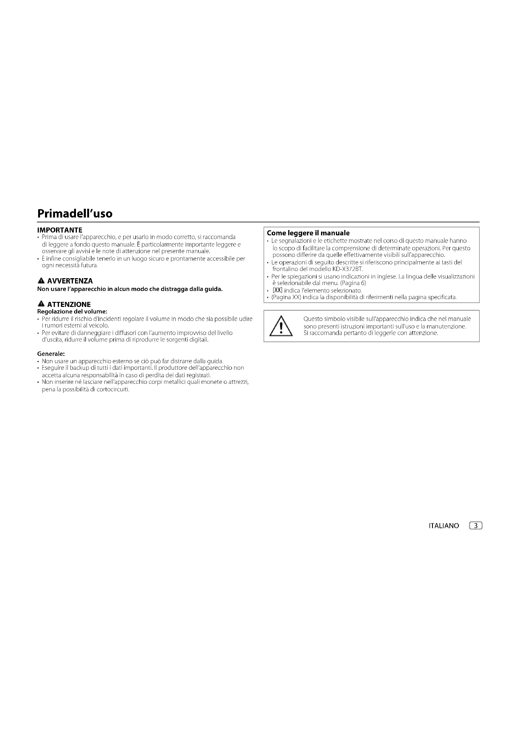 - (Pagina XX) indica la disponibilità di riferimenti nella pagina specificata. Questo simbolo visibile sull’apparecchio indica che nel manuale sono presenti istruzioni importanti sull’uso e la manutenzione. Si raccomanda pertanto di leggerle con attenzione. JS_JVC_KD_X372BT_E_IT.indd 3JS_JVC_KD_X372BT_E_IT.indd 3 22/7/2019 9:25:40 AM22/7/2019 9:25:40 AM4 ITALIANO Data Size: B6L (182 mm x 128 mm)Book Size: B6L (182 mm x 128 mm) Fondamenti Per Dal frontalino Accendere l’impianto Premere B SRC.