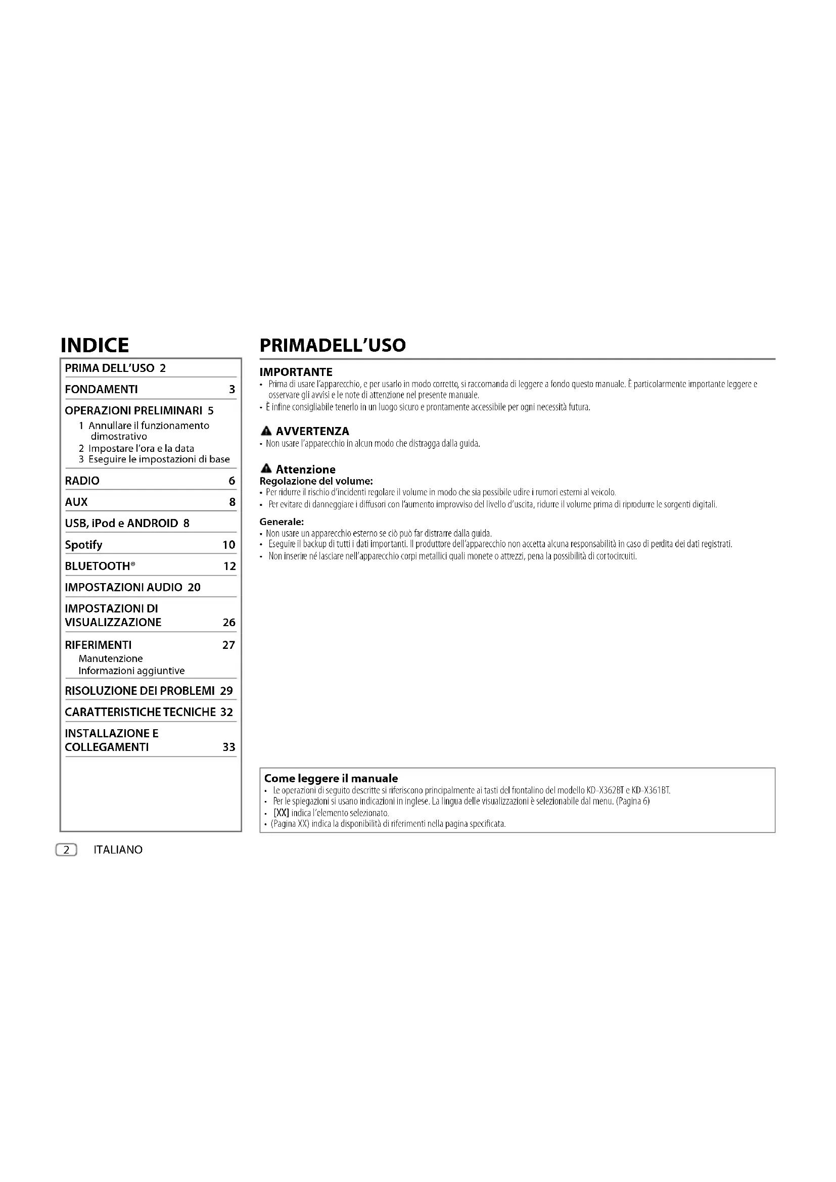 FONDAMENTI 3 OPERAZIONI PRELIMINARI 5 1 Annullare il funzionamento dimostrativo 2 Impostare l’ora e la data 3 Eseguire le impostazioni di base RADIO 6 AUX 8 USB, iPod e ANDROID 8 Spotify 10 BLUETOOTH® 12 IMPOSTAZIONI AUDIO 20 IMPOSTAZIONI DI VISUALIZZAZIONE 26 RIFERIMENTI 27 Manutenzione Informazioni aggiuntive