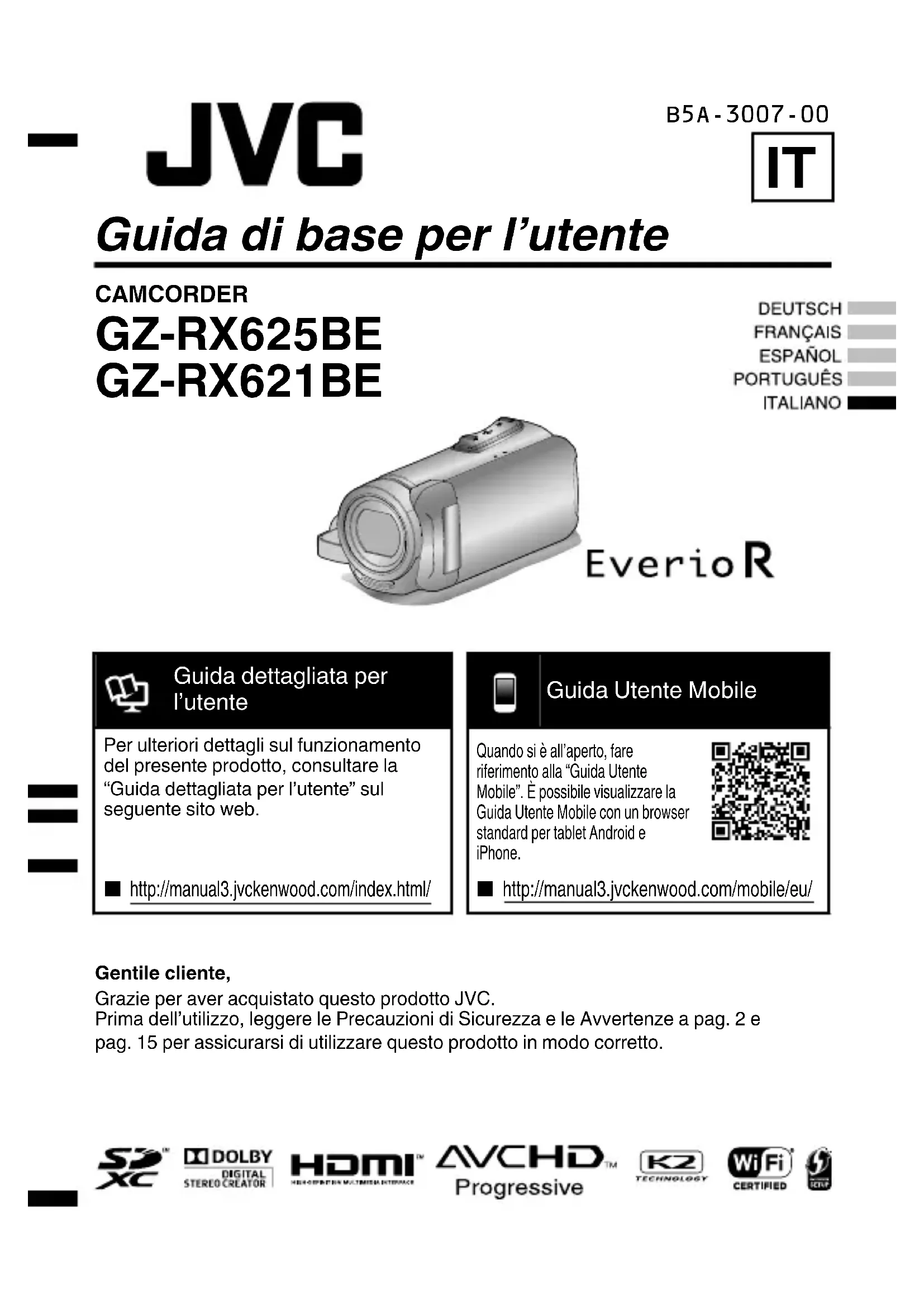 0119TOH-SW-MT 18 PTGuida di base per l’utente CAMCORDER GZ-RX625BE GZ-RX621BE Gentile cliente,Grazie per aver acquistato questo prodotto JVC.Prima dell’utilizzo, leggere le Precauzioni di Sicurezza e le Avvertenze a pag. 2 epag. 15 per assicurarsi di utilizzare questo prodotto in modo corretto. B5A-3007-00