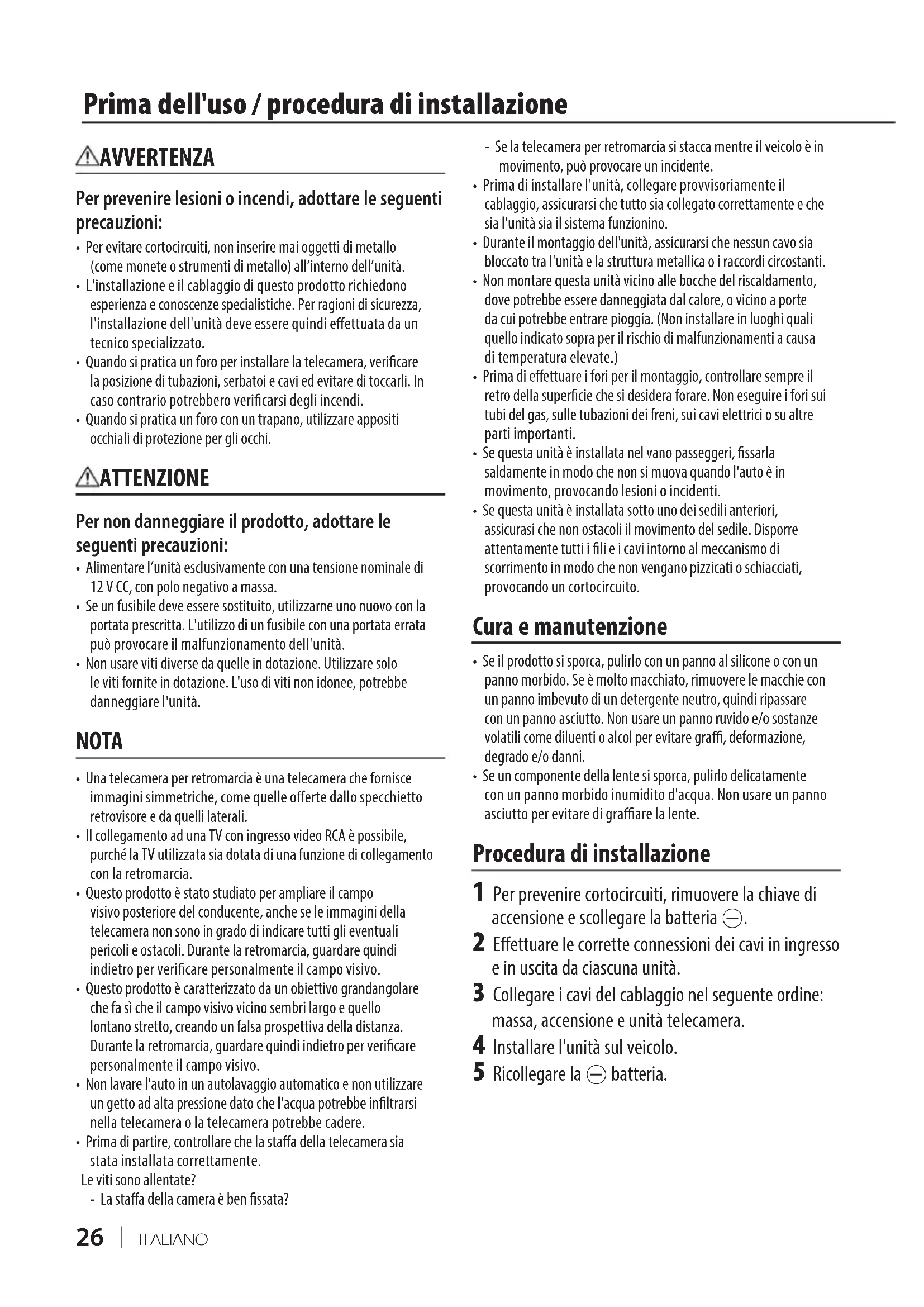 - Una telecamera per retromarcia è una telecamera che fornisce immagini simmetriche, come quelle oerte dallo specchietto retrovisore e da quelli laterali.• Il collegamento ad una TV con ingresso video RCA è possibile, purché la TV utilizzata sia dotata di una funzione di collegamento con la retromarcia.• Questo prodotto è stato studiato per ampliare il campo visivo posteriore del conducente, anche se le immagini della telecamera non sono in grado di indicare tutti gli eventuali pericoli e ostacoli. Durante la retromarcia, guardare quindi indietro per vericare personalmente il campo visivo.• Questo prodotto è caratterizzato da un obiettivo grandangolare che fa sì che il campo visivo vicino sembri largo e quello lontano stretto, creando un falsa prospettiva della distanza. Durante la retromarcia, guardare quindi indietro per vericare personalmente il campo visivo.• Non lavare l'auto in un autolavaggio automatico e non utilizzare un getto ad alta pressione dato che l'acqua potrebbe inltrarsi nella telecamera o la telecamera potrebbe cadere.• Prima di partire, controllare che la staa della telecamera sia stata installata correttamente. Le viti sono allentate?- La staa della camera è ben ssata? Prima dell'uso / procedura di installazioneITALIANO