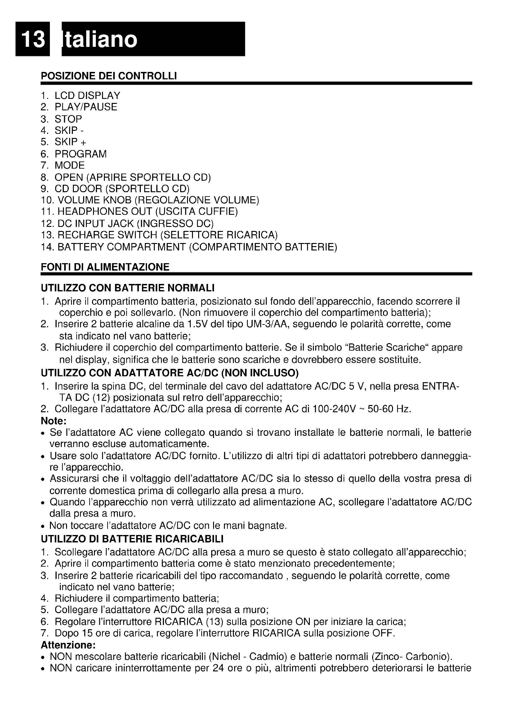 Attenzione: NON mescolare batterie ricaricabili (Nichel - Cadmio) e batterie normali (Zinco- Carbonio). NON caricare ininterrottamente per 24 ore o più, altrimenti potrebbero deteriorarsi le batterie14
