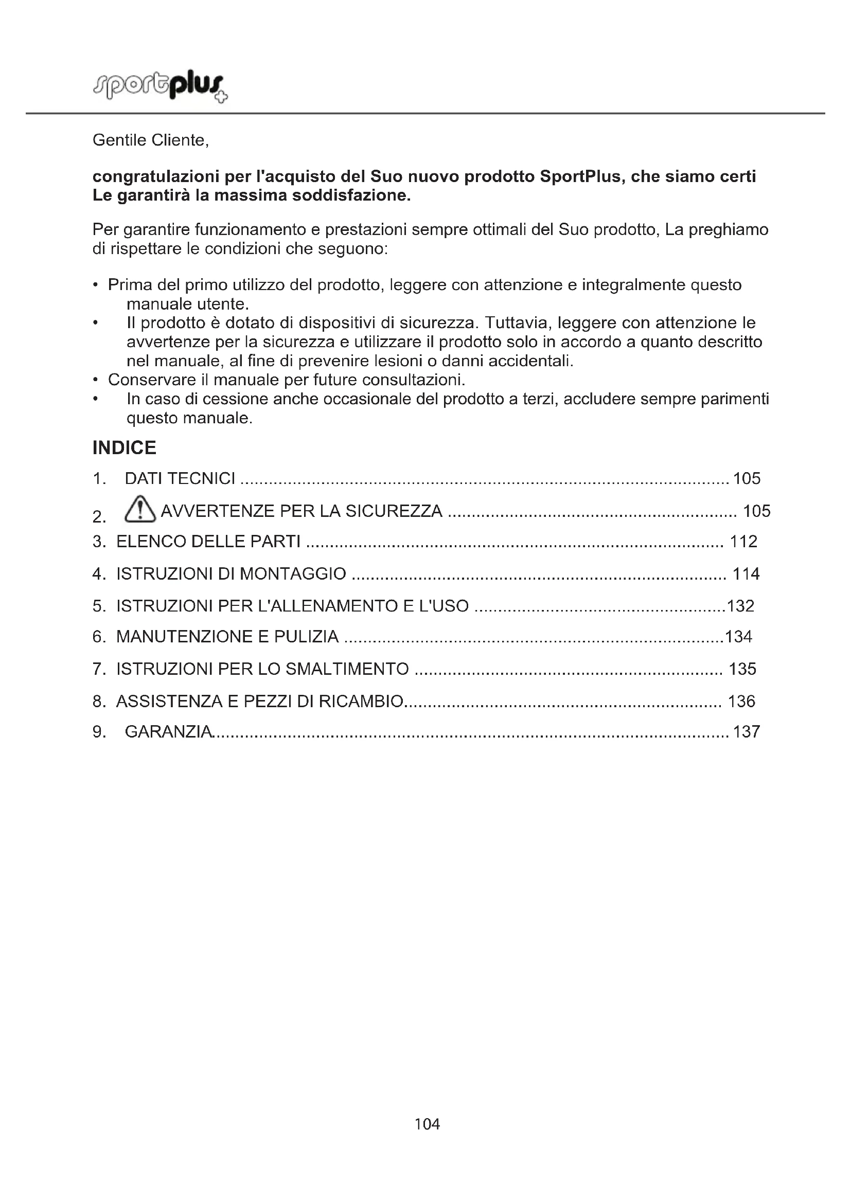 - Lusure du produit et sur les matriau utiliss est aussi eclue. Le produit est seulement destin un usage priv. Aucune garantie nest accorde lors dune utilisation commerciale. SP-T-244/305/366-IM-INT-03.indb 103 18/1/2018 10:23 AM104 Gentile Cliente, congratulazioni per l'acquisto del Suo nuovo prodotto SportPlus, che siamo certi Le garantirà la massima soddisfazione. Per garantire funzionamento e prestazioni sempre ottimali del Suo prodotto, La preghiamo di rispettare le condizioni che seguono: