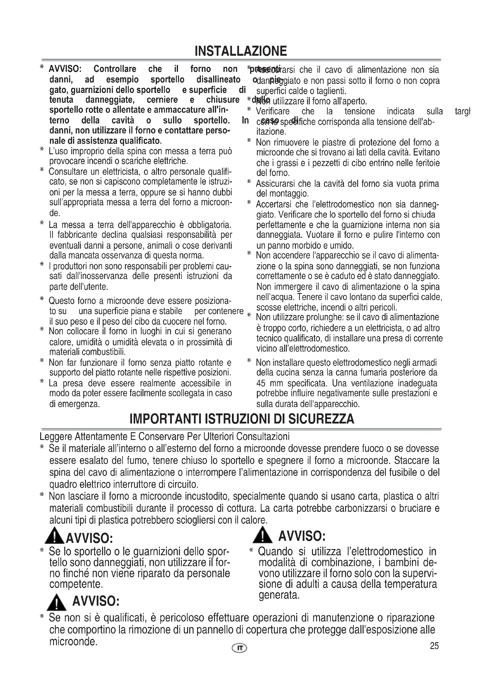 - Gli interventi di assistenza devono essere esclusivamente effettuati da personale tecnico qualificato/autorizzato. Suggeriamo pertanto di non procedere alla rimozione dei pannelli di copertura del forno. Il cavo di alimentazione deve essere sostituito con cavo originale, da personale specializzato dispo- nibile tramite la rete di Centri di Assistenza Autorizzati. Il cavo di alimentazione deve essere sostitui- to solo da personale specializzato.27