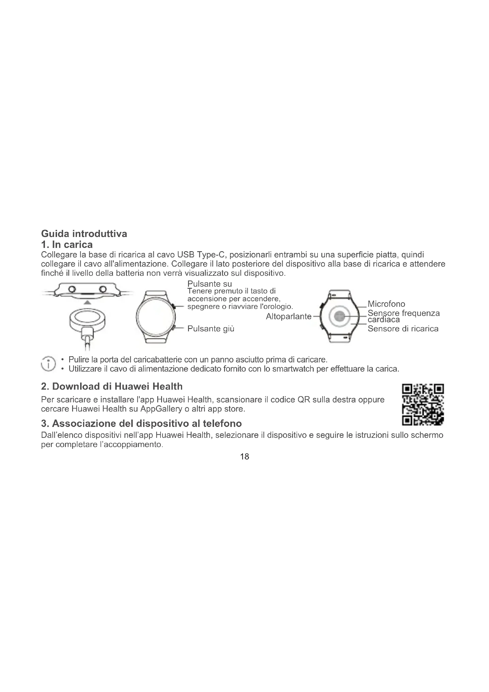 Dall’elenco dispositivi nell’app Huawei Health, selezionare il dispositivo e seguire le istruzioni sullo schermo per completare l’accoppiamento. Guida introduttiva Pulsante su Tenere premuto il tasto di accensione per accendere, spegnere o riavviare l'orologio. Pulsante giù Sensore frequenza cardiaca Sensore di ricarica Altoparlante Microfono Per scaricare e installare l'app Huawei Health, scansionare il codice QR sulla destra oppure cercare Huawei Health su AppGallery o altri app store.19 Copyright © Huawei 2020. Tutti i diritti riservati. QUESTO DOCUMENTO HA FINALITÀ PURAMENTE INFORMATIVA E NON COSTITUISCE ALCUN TIPO DI GARANZIA. Marchi e autorizzazioni Il marchio e i loghi Bluetooth