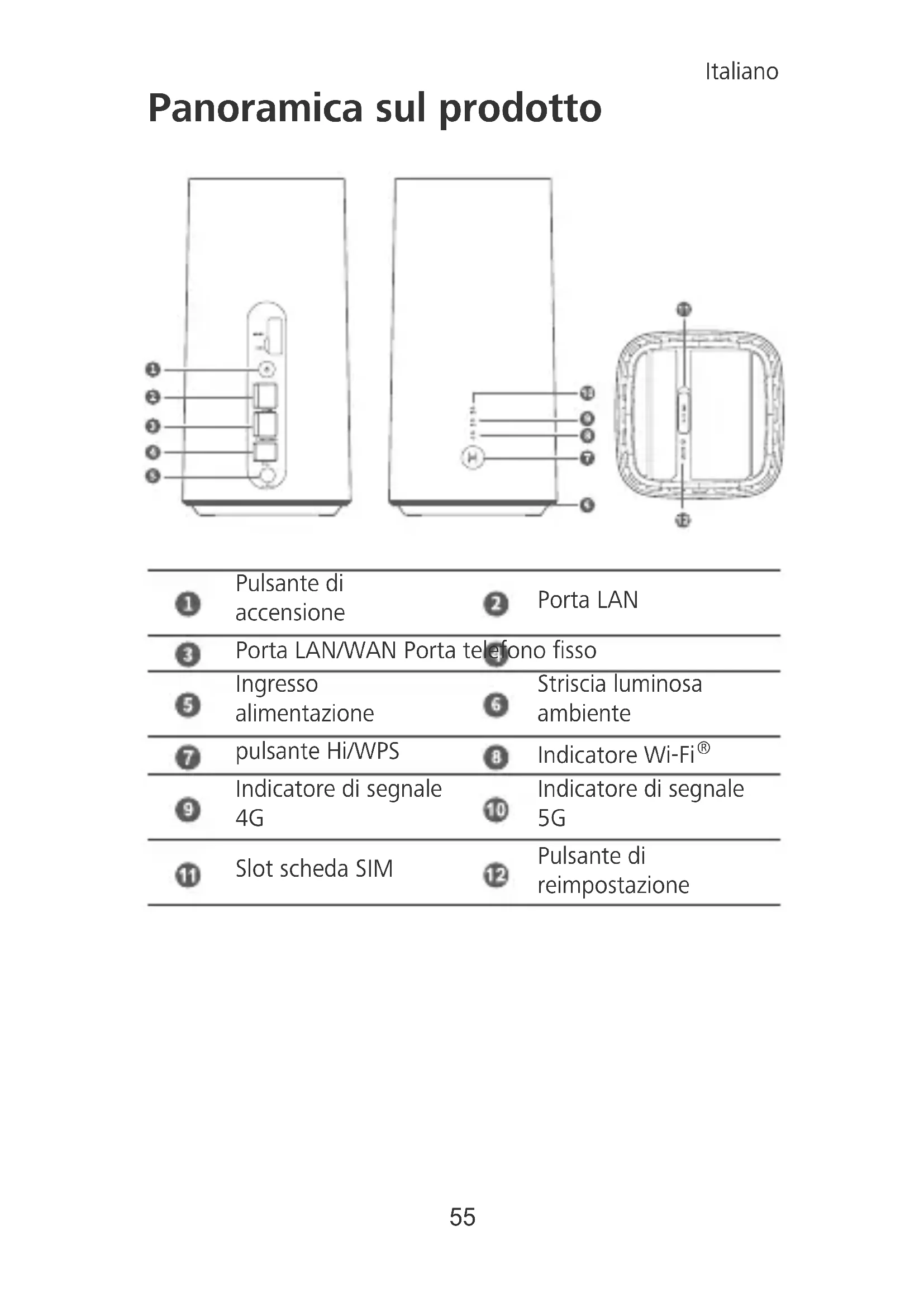 60Congurazioni facoltative Le funzioni descritte in questa sezione sono esclusivamente a scopo di riferimento. Il router potrebbe non supportare tutte queste funzioni. Connessione di più dispositivi È possibile connettere un computer o un telefono sso al router per accedere a Internet, effettuare chiamate e altro ancora. MAIN DIV LAN1 LAN2/WAN TEL Accesso a Internet tramite il collegamento a una porta Ethernet Per accedere a Internet, è possibile collegare il router a una porta Ethernet a muro usando un cavo Ethernet. Congurare le relative impostazioni nella pagina Web di gestione prima di collegarsi a Internet tramite porta Ethernet. Per ulteriori informazioni, contattare il proprio operatore. 6162Domande frequenti Come si possono ripristinare le impostazioni di fabbrica? Con il router acceso, premere il Pulsante di reimpostazione per circa 3 secondi utilizzando un oggetto appuntito, no a quando la Striscia luminosa ambiente inizia a lampeggiare. Il ripristino delle impostazioni di fabbrica reimposterà le impostazioni sui valori predeniti. Una volta ripristinato il router, è possibile ricongurare le impostazioni. Come fare se si dimentica la password del Wi-Fi o il la password di login della pagina Web di gestione? Ripristinare le impostazioni di fabbrica del router e usare la password predenita del Wi-Fi e password di login per riprovare. Cosa fare se l'Indicatore di segnale 5G e l'Indicatore di segnale 4G sono spenti oppure non è possibile stabilire una connessione Internet? 1 Vericare che la scheda SIM è inserita. Fare riferimento alla sezione Installazione per la giusta dimensione della scheda SIM e il modo corretto di inserirla nello slot. 2 Se il problema persiste, ripristinare le impostazioni di fabbrica del router e riprovare. 3 Contattare l'operatore per vericare che la scheda SIM non sia fuori servizio. Se la scheda è nuova, controllare che sia stata attivata. Cosa fare se la velocità di Internet è bassa? 1 Controllare l'Indicatore di segnale 5G e l’Indicatore di segnale 4G sul router. Se entrambi sono rossi, regolare la 63direzione del router o avvicinarlo a una nestra per migliorare la ricezione del segnale. 2 Se il dispositivo è connesso al router via Wi-Fi, riposizionare il dispositivo per ricevere meglio il segnale. 3 Se il dispositivo lo supporta, passare al Wi-Fi 5 GHz. 4 Riavviare il router e il dispositivo, poi riprovare. 5 Controllare di non aver raggiunto la soglia dati mensile. In caso affermativo, è possibile che l'operatore limiti la velocità di Internet. Come ci si connette al router mediante la funzione Wi-Fi Protected Setup (WPS)? Per collegare un dispositivo compatibile WPS al router mediante il pulsante Hi/WPS: 1 Premere e tenere premuto pulsante Hi/WPS sul router per almeno 1 secondo e rilasciarlo, Indicatore Wi-Fi inizia a lampeggiare. 2 Abilitare WPS sul dispositivo entro 2 minuti per collegarlo alla rete Wi-Fi del router. Perché non si riesce ad accedere alla pagina Web di gestione del router? 1 Assicurarsi che il computer sia collegato al router mediante un cavo Ethernet o connesso a una rete Wi-Fi. 2 Assicurarsi che il computer sia impostato per l'acquisizione automatica dell'indirizzo IP e dell'indirizzo del server DNS. 3 Riavviare il browser o provare a utilizzare un altro browser. 4 Se il problema persiste, ripristinare le impostazioni di fabbrica del router. Per quale motivo i contenuti visualizzati nella pagina Web di gestione non sono aggiornati? In base alla cache del browser, i contenuti per il dispositivo nella pagina Web di gestione potrebbero non essere aggiornati. Cancellare manualmente la cache del browser (ad 64esempio, aprire il browser e selezionare Opzioni Internet (Internet Options) > Generale (General) > Cronologia esplorazioni (Browsing history) > Elimina (Delete).) e riaprire la pagina web di gestione. Il mio router supporta il Wi-Fi a 5 GHz? Come è possibile connettersi al Wi-Fi a 5 GHz? 1 Sì. Il router supporta il Wi-Fi a 5 GHz, che è più veloce e meno sensibile alle interferenze. Tuttavia, non penetra nelle pareti come il Wi-Fi a 2,4 GHz e può essere utilizzato solo su dispositivi che supportano il Wi-Fi a 5 GHz. 2 Se è stata attivata la funzione che assegna la priorità a 5 GHz sul router, le reti a 2,4 GHz e 5 GHz condivideranno lo stesso nome di rete e si verrà automaticamente connessi alla rete più veloce. Se questa funzione è disattivata, verranno visualizzati due nomi di rete Wi-Fi. Connettersi alla rete Wi-Fi che termina con “_5G”. È possibile gestire questa funzione nella pagina Web di gestione del router. Se si riscontrano altri problemi col router: 1 Riavviare il router. 2 Ripristinare le impostazioni di fabbrica del router. 3 Contattare l'operatore. 65Informazioni sulla sicurezza Copyright © Huawei Technologies Co., Ltd. 2019. Tutti i diritti riservati.