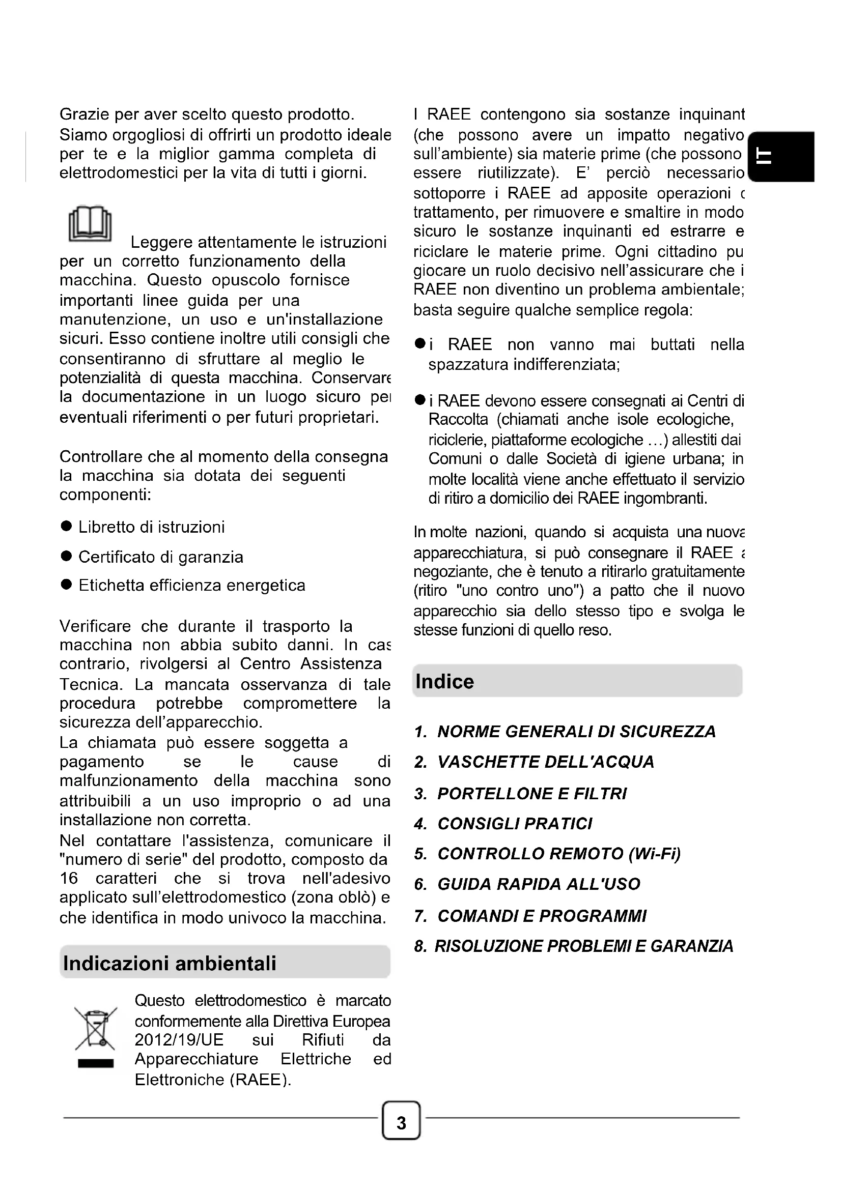Grazie per aver scelto questo prodotto. Siamo orgogliosi di offrirti un prodotto ideale per te e la miglior gamma completa di elettrodomestici per la vita di tutti i giorni. Leggere attentamente le istruzioni per un corretto funzionamento della macchina. Questo opuscolo fornisce importanti linee guida per una manutenzione, un uso e un'installazione sicuri. Esso contiene inoltre utili consigli che consentiranno di sfruttare al meglio le potenzialità di questa macchina. Conservare la documentazione in un luogo sicuro per eventuali riferimenti o per futuri proprietari. Controllare che al momento della consegna la macchina sia dotata dei seguenti componenti: ! Libretto di istruzioni ! Certificato di garanzia ! Etichetta efficienza energetica Verificare che durante il trasporto la macchina non abbia subito danni. In caso contrario, rivolgersi al Centro Assistenza Tecnica. La mancata osservanza di tale procedura potrebbe compromettere la sicurezza dell’apparecchio. La chiamata può essere soggetta a pagamento se le cause di malfunzionamento della macchina sono attribuibili a un uso improprio o ad una installazione non corretta. Nel contattare l'assistenza, comunicare il "numero di serie" del prodotto, composto da 16 caratteri che si trova nell'adesivo applicato sull’elettrodomestico (zona oblò) e che identifica in modo univoco la macchina.