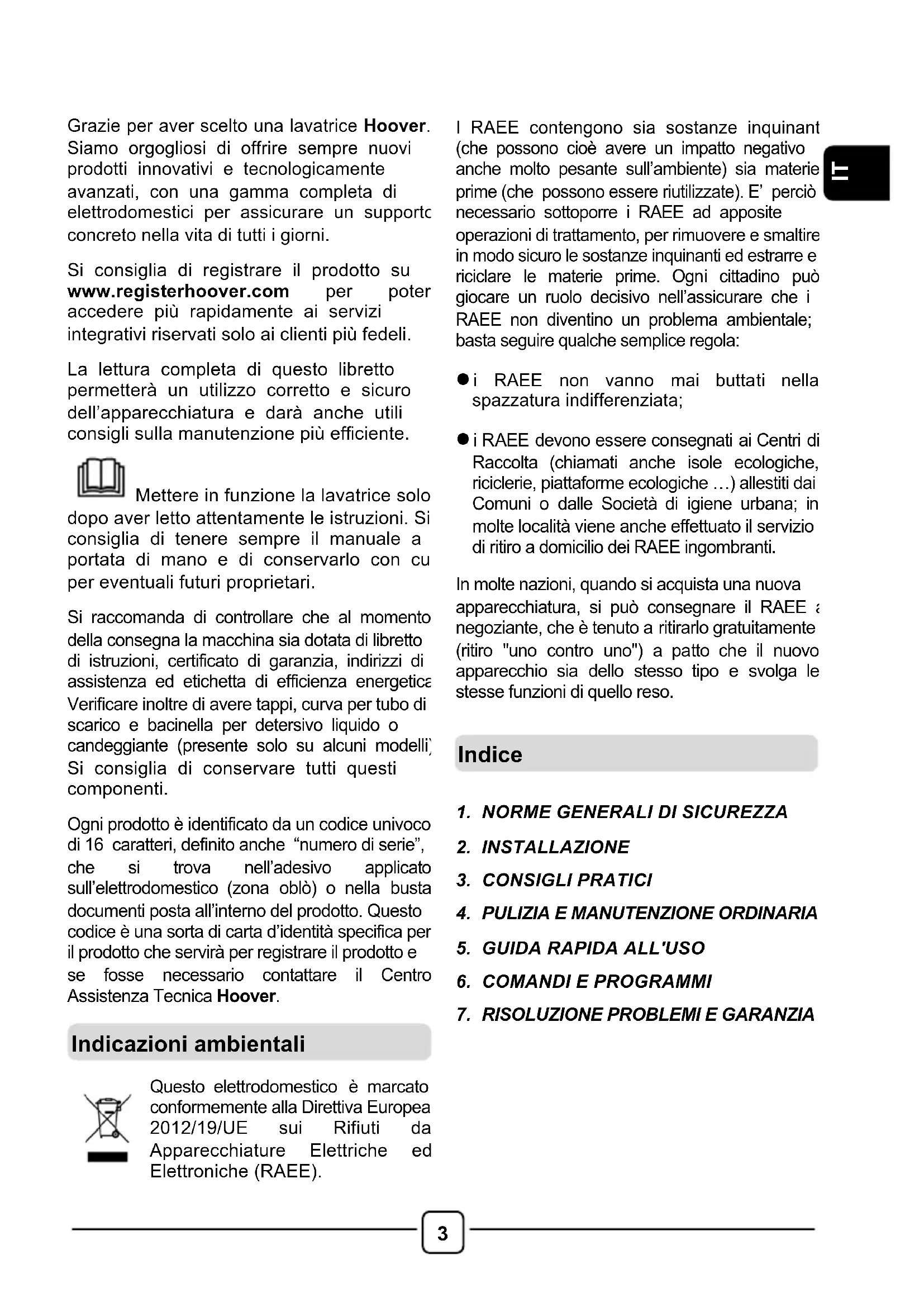 Grazie per aver scelto una lavatrice Hoover. Siamo orgogliosi di offrire sempre nuovi prodotti innovativi e tecnologicamente avanzati, con una gamma completa di elettrodomestici per assicurare un supporto concreto nella vita di tutti i giorni. Si consiglia di registrare il prodotto su www.registerhoover.com per poter accedere più rapidamente ai servizi integrativi riservati solo ai clienti più fedeli. La lettura completa di questo libretto permetterà un utilizzo corretto e sicuro dell’apparecchiatura e darà anche utili consigli sulla manutenzione più efficiente. Mettere in funzione la lavatrice solo dopo aver letto attentamente le istruzioni. Si consiglia di tenere sempre il manuale a portata di mano e di conservarlo con cura per eventuali futuri proprietari. Si raccomanda di controllare che al momento della consegna la macchina sia dotata di libretto di istruzioni, certificato di garanzia, indirizzi di assistenza ed etichetta di efficienza energetica. Verificare inoltre di avere tappi, curva per tubo di scarico e bacinella per detersivo liquido o candeggiante (presente solo su alcuni modelli). Si consiglia di conservare tutti questi componenti.