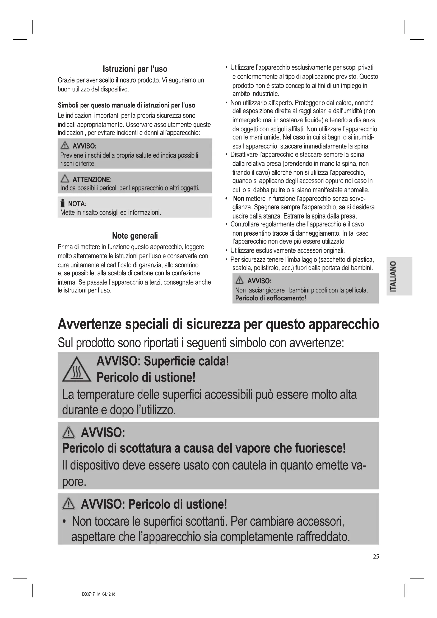 AVVISO: Rischio di ustioni! Fuoriuscita di vapore caldo!DB3717_IM 04.12.18