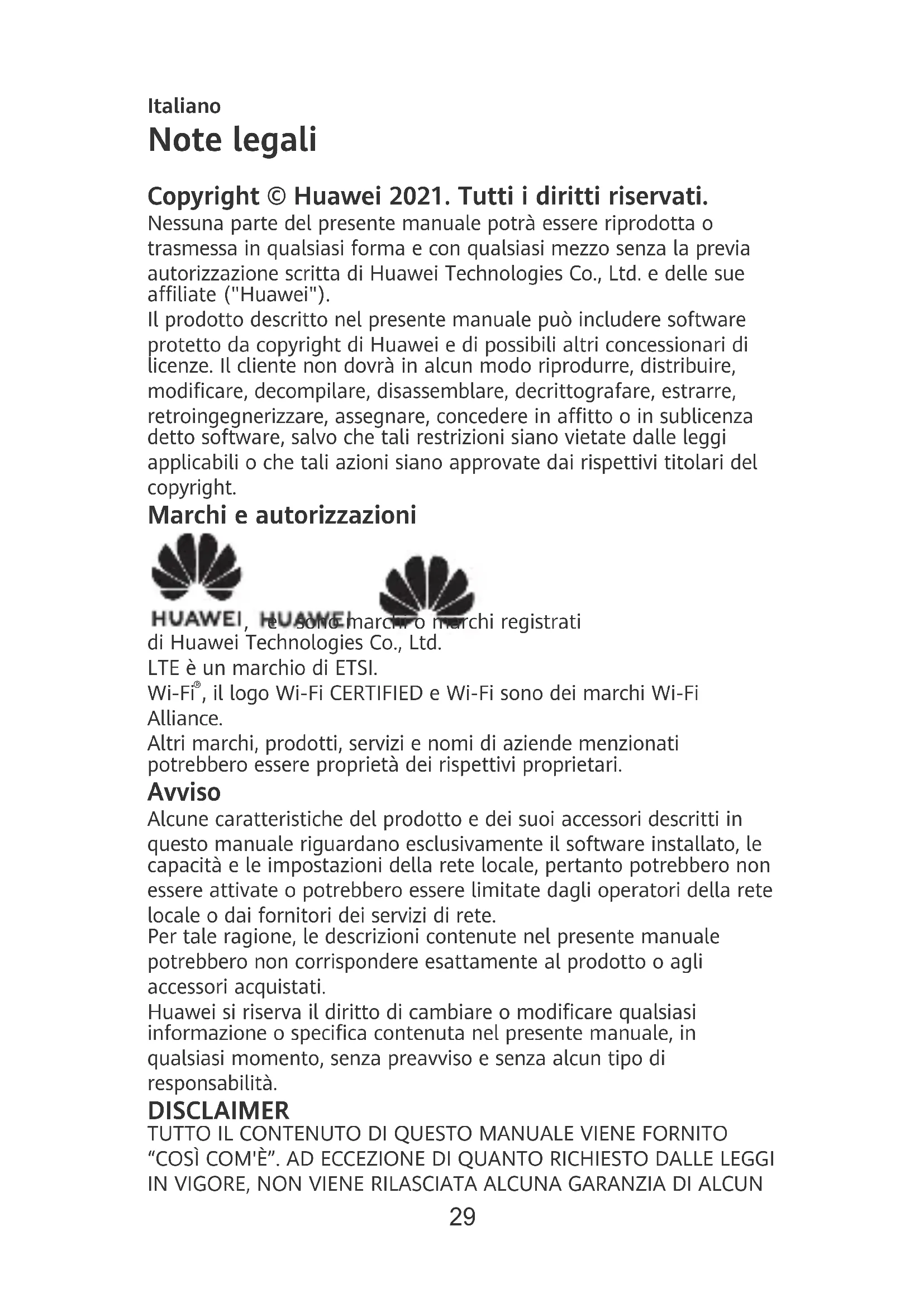 , il logo Wi-Fi CERTIFIED e Wi-Fi sono dei marchi Wi-Fi Alliance. Altri marchi, prodotti, servizi e nomi di aziende menzionati potrebbero essere proprietà dei rispettivi proprietari. Avviso Alcune caratteristiche del prodotto e dei suoi accessori descritti in questo manuale riguardano esclusivamente il software installato, le capacità e le impostazioni della rete locale, pertanto potrebbero non essere attivate o potrebbero essere limitate dagli operatori della rete locale o dai fornitori dei servizi di rete. Per tale ragione, le descrizioni contenute nel presente manuale potrebbero non corrispondere esattamente al prodotto o agli accessori acquistati. Huawei si riserva il diritto di cambiare o modicare qualsiasi informazione o specica contenuta nel presente manuale, in qualsiasi momento, senza preavviso e senza alcun tipo di responsabilità. DISCLAIMER TUTTO IL CONTENUTO DI QUESTO MANUALE VIENE FORNITO “COSÌ COM'È”. AD ECCEZIONE DI QUANTO RICHIESTO DALLE LEGGI IN VIGORE, NON VIENE RILASCIATA ALCUNA GARANZIA DI ALCUN 29TIPO, ESPLICITA O IMPLICITA, INCLUSE LE GARANZIE IMPLICITE DI COMMERCIABILITÀ O IDONEITÀ PER UN PARTICOLARE SCOPO, IN