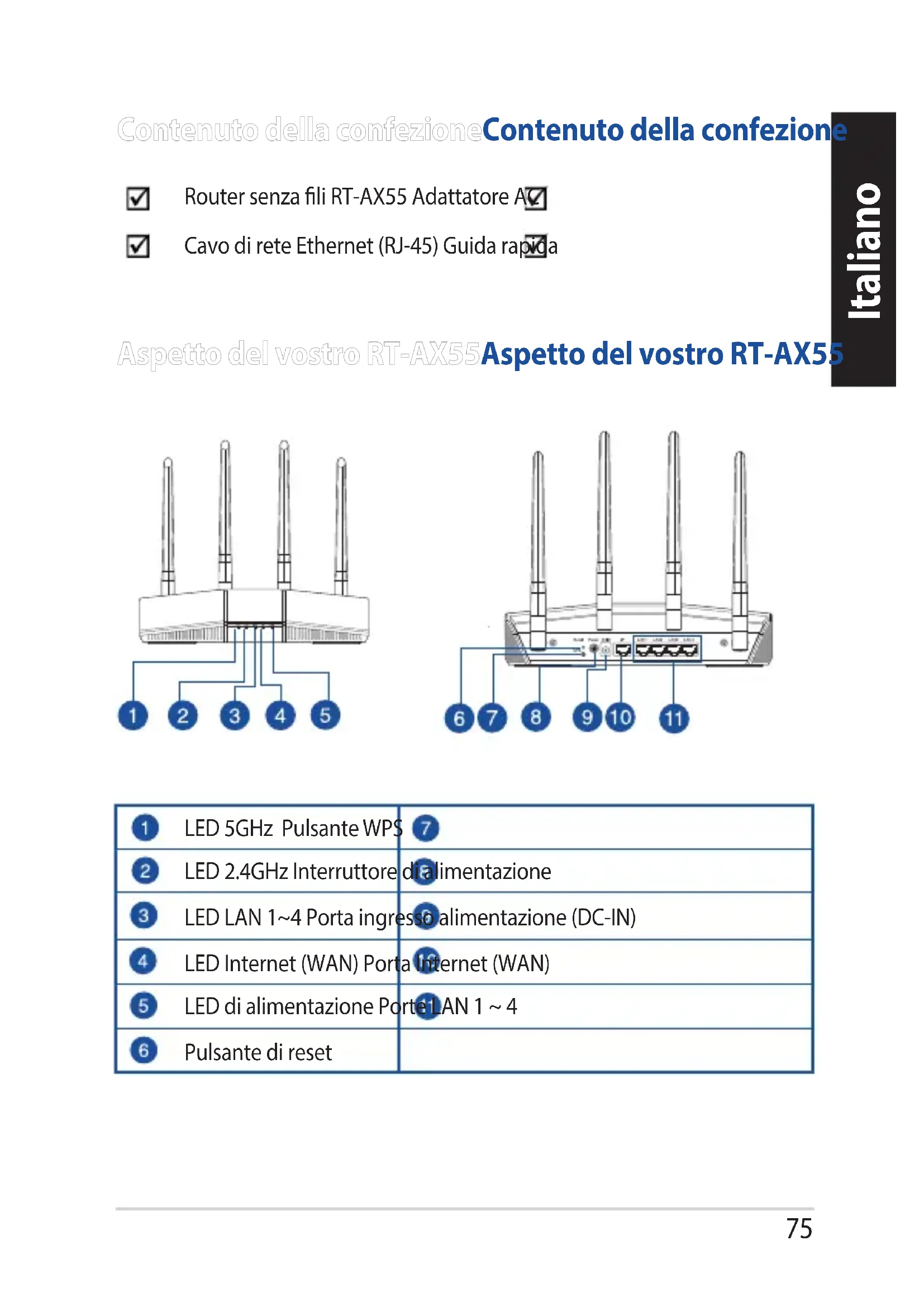 - A felhasználói útmutató online verziója a https://www.asus.com/support címen érhető el75 Italiano Aspetto del vostro RT-AX55Aspetto del vostro RT-AX55 Contenuto della confezioneContenuto della confezione Router senza li RT-AX55 Adattatore AC Cavo di rete Ethernet (RJ-45) Guida rapida LED 5GHz Pulsante WPS LED 2.4GHz Interruttore di alimentazione LED LAN 1~4 Porta ingresso alimentazione (DC-IN) LED Internet (WAN) Porta Internet (WAN) LED di alimentazione Porte LAN 1 ~ 4 Pulsante di reset76 Italiano Posizionamento del vostro router wirelessPosizionamento del vostro router wireless Per ottenere una migliore trasmissione del segnale tra il router wireless e i dispositivi di rete connessi assicuratevi di: