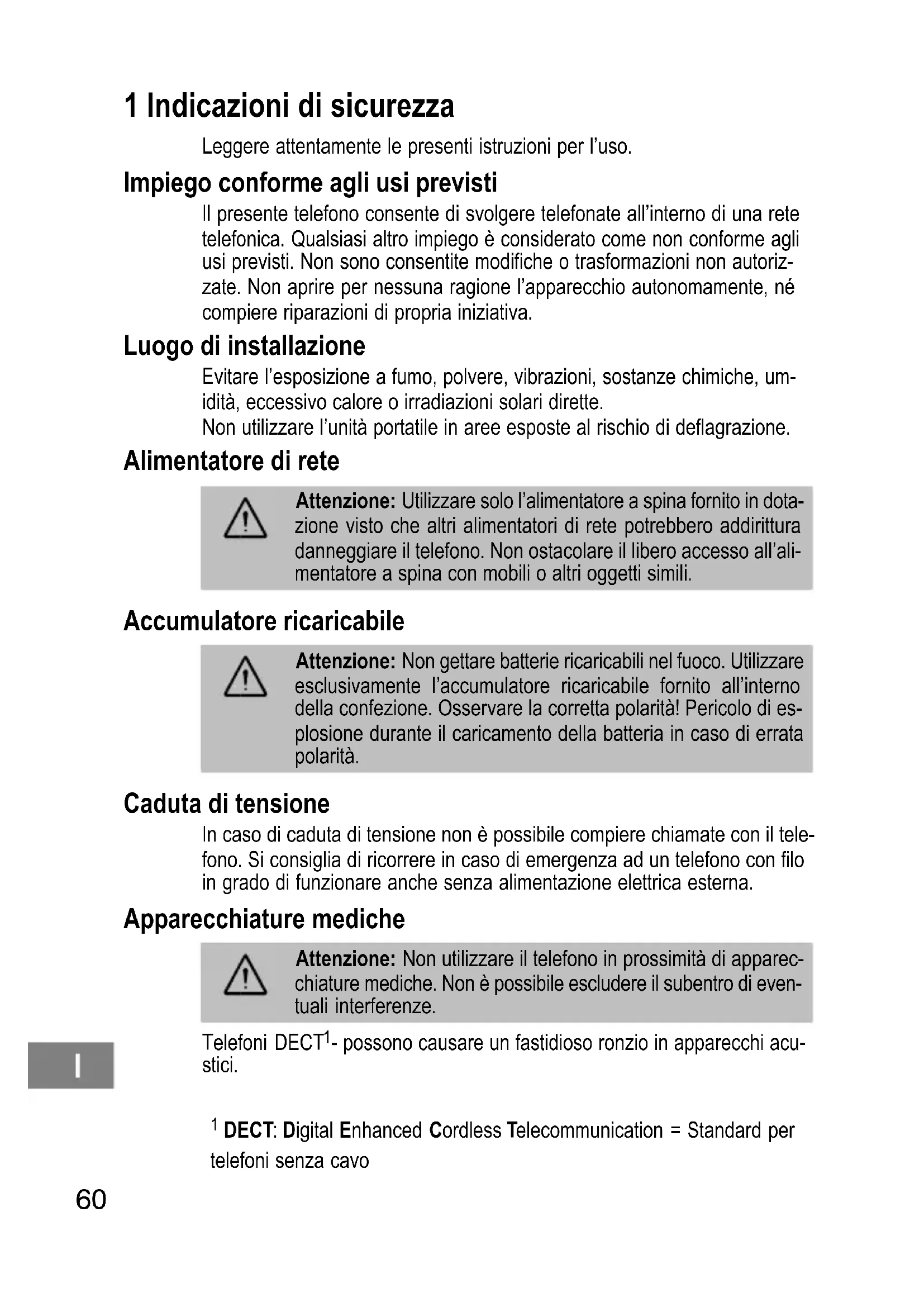 - Garanzia 85 1 Indicazioni di sicurezza Leggere attentamente le presenti istruzioni per l´uso. Impiego conforme agli usi previsti Il presente telefono consente di svolgere telefonate all´interno di una rete telefonica. Qualsiasi altro impiego è considerato come non conforme agli usi previsti. Non sono consentite modifiche o trasformazioni non autoriz- zate. Non aprire per nessuna ragione l´apparecchio autonomamente, né compiere riparazioni di propria iniziativa. Luogo di installazione Evitare l´esposizione a fumo, polvere, vibrazioni, sostanze chimiche, um- idità, eccessivo calore o irradiazioni solari dirette. Non utilizzare l´unità portatile in aree esposte al rischio di deflagrazione. Alimentatore di rete Attenzione: Utilizzare solo l´alimentatore a spina fornito in dota- zione visto che altri alimentatori di rete potrebbero addirittura danneggiare il telefono. Non ostacolare il libero accesso all´ali- mentatore a spina con mobili o altri oggetti simili. Accumulatore ricaricabile Attenzione: Non gettare batterie ricaricabili nel fuoco. Utilizzare esclusivamente l´accumulatore ricaricabile fornito all´interno della confezione. Osservare la corretta polarità! Pericolo di es- plosione durante il caricamento della batteria in caso di errata polarità. Caduta di tensione In caso di caduta di tensione non è possibile compiere chiamate con il tele- fono. Si consiglia di ricorrere in caso di emergenza ad un telefono con filo in grado di funzionare anche senza alimentazione elettrica esterna. Apparecchiature mediche Attenzione: Non utilizzare il telefono in prossimità di apparec- chiature mediche. Non è possibile escludere il subentro di even- tuali interferenze. Telefoni DECT p. 60