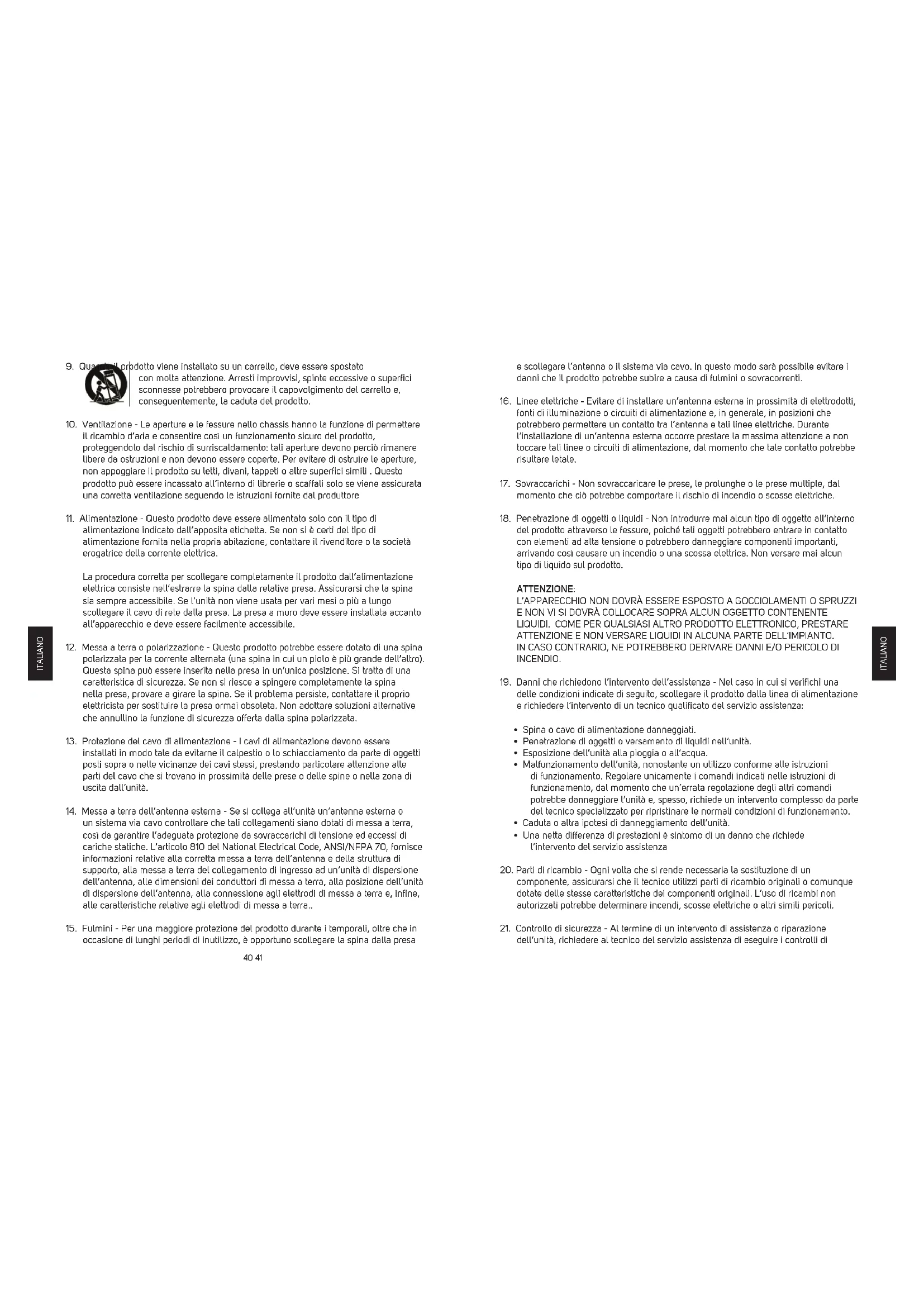 fonti di illuminazione o circuiti di alimentazione e, in generale, in posizioni che potrebbero permettere un contatto tra l’antenna e tali linee elettriche. Durante l’installazione di un’antenna esterna occorre prestare la massima attenzione a non toccare tali linee o circuiti di alimentazione, dal momento che tale contatto potrebbe risultare letale.