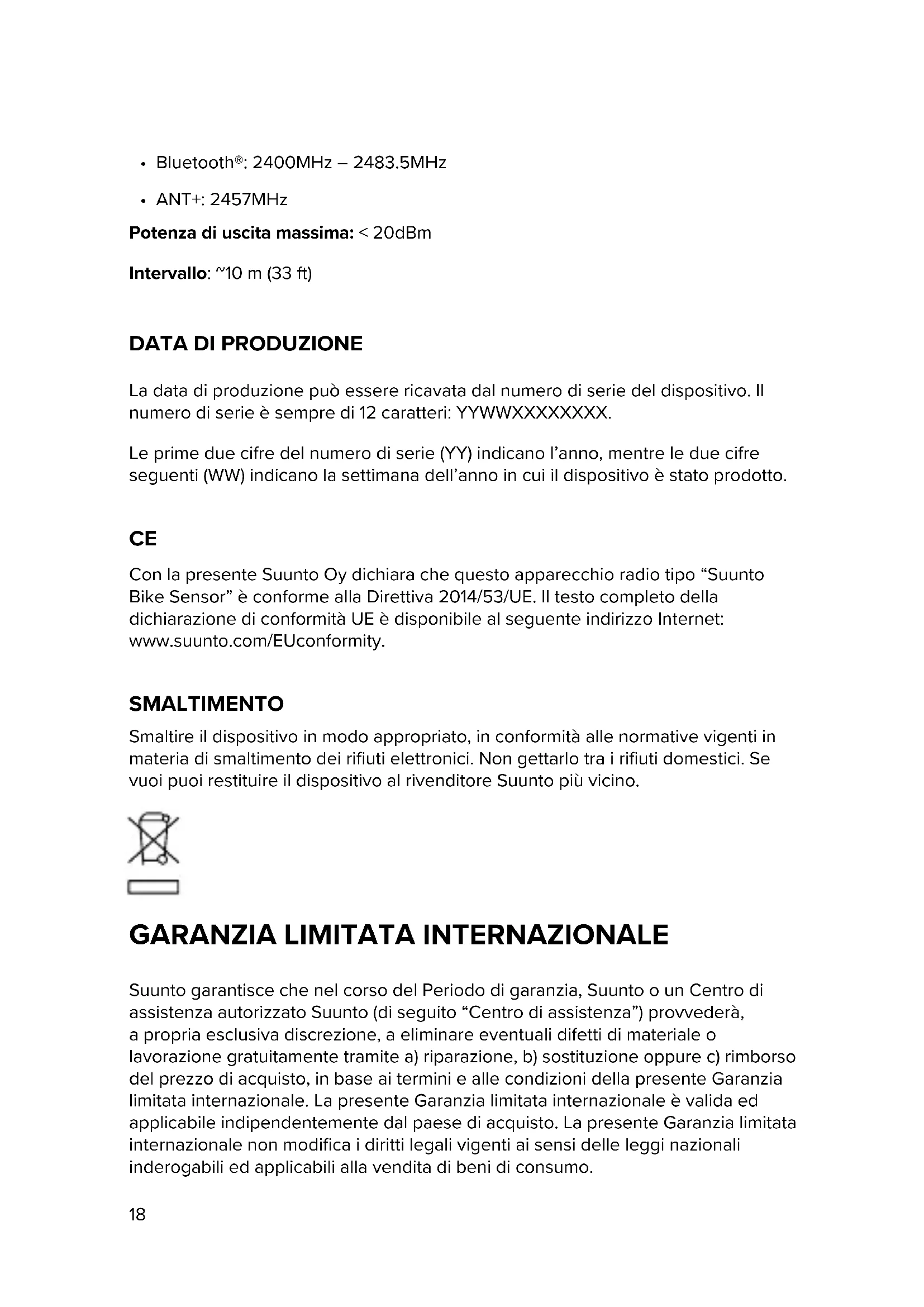 Con la presente Suunto Oy dichiara che questo apparecchio radio tipo “Suunto Bike Sensor” è conforme alla Direttiva 2014/53/UE. Il testo completo della dichiarazione di conformità UE è disponibile al seguente indirizzo Internet: www.suunto.com/EUconformity. SMALTIMENTO Smaltire il dispositivo in modo appropriato, in conformità alle normative vigenti in materia di smaltimento dei rifiuti elettronici. Non gettarlo tra i rifiuti domestici. Se vuoi puoi restituire il dispositivo al rivenditore Suunto più vicino.
