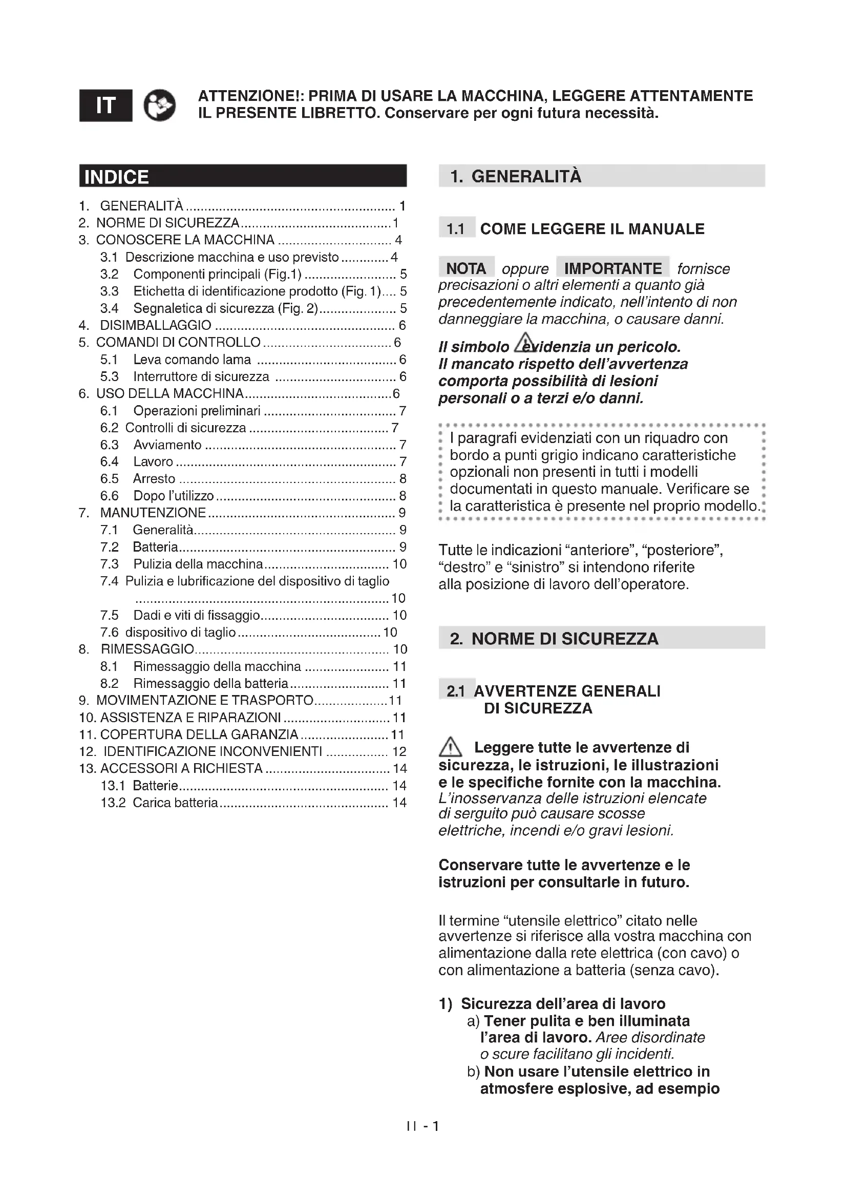 IMPORTANTE Le norme di sicurezza da seguire sono descritte al cap. 2. Rispettare scrupolosamente tali indicazioni per non incorrere in gravi rischi o pericoli.IT - 7