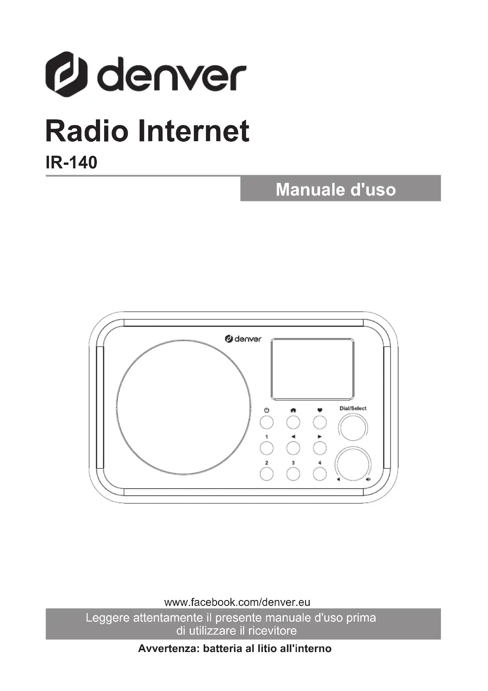Omega 5A, Soeften DK-8382 Hinnerup Danemark www.facebook.com/denver.eu www.denver.eu FRA-12IR-140 Radio Internet Manuale d'uso Leggere attentamente il presente manuale d'uso prima di utilizzare il ricevitore Avvertenza: batteria al litio all'interno www.facebook.com/denver.euInformazioni sulla sicurezza Leggere attentamente le istruzioni di sicurezza prima di utilizzare il prodotto per la prima volta. Conservare le istruzioni per riferimento futuro.