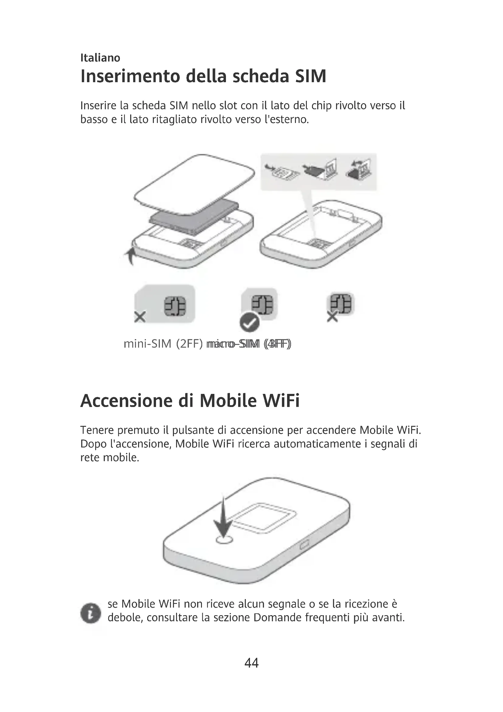 Pulsante di accensione Per spegnere Mobile WiFi: tenere premuto il pulsante di accensione nché non si spegne lo schermo LCD. Per ripristinare le impostazioni di fabbrica di Mobile WiFi: con Mobile WiFi acceso, utilizzare un oggetto appuntito per tenere premuto il pulsante di ripristino. Domande frequenti Che cosa fare se Mobile WiFi non riceve alcun segnale o non si connette a Internet?