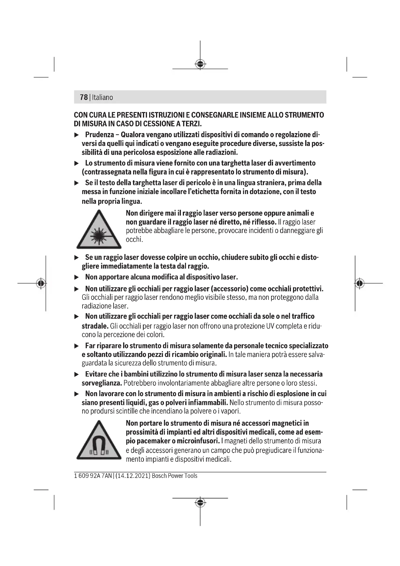 Classe laser 2 Tipo di laser 630–650nm, <1mW C₆ 1 Divergenza 0,5mrad (angolo giro) Attacco treppiede 1/4"; 5/8" Pile 3×1,5V LR6(AA) Autonomia in modalità di funzionamento – Modalità a linee incrociate 9h – Modalità lineare 17h 1 609 92A 7AN | (14.12.2021) Bosch Power ToolsItaliano | 81 Livella laser a linee GLL 2-10 Peso secondo EPTA-Procedure01:2014 0,49kg Dimensioni (lunghezza× larghezza× altezza) 112× 55× 106mm Grado di protezione IP54 (con protezione con- trola polvere e gli schizzi d’acqua) A) In caso di condizioni ambientali sfavorevoli (ad es. irradiazione solare diretta), il raggio d’azione potrà risultare ridotto. B) Presenza esclusivamente di contaminazioni non conduttive, ma che, in alcune occasioni, posso- no essere rese temporaneamente conduttive dalla condensa. Per un’identificazione univoca dello strumento di misura, consultare il numero di serie (10) riportato sulla targhetta identificativa. Montaggio Introduzione/sostituzione delle pile Per l’impiego dello strumento di misura si raccomanda di utilizzare pile alcaline al manga- nese. Per aprire il coperchio del vano batterie(11) esercitare pressione sul bloccaggio(12) e quindi rimuovere il coperchio. Introdurre le batterie. Durante tale fase, prestare attenzione alla corretta polarità, riportata sul lato interno del vano batterie. Se l’indicatore di stato(7) lampeggia, significa che le batterie sono scariche. Dopo il pri- mo lampeggio, lo strumento di misura avrà un’autonomia residua di circa 1h. Sostituire sempre tutte le pile contemporaneamente. Utilizzare esclusivamente pile dello stesso produttore e con la stessa capacità. u Se lo strumento di misura non viene impiegato per lunghi periodi, rimuovere le pile dallo strumento stesso. Qualora le batterie rimangano per lungo tempo all’inter- no dello strumento di misura si possono verificare fenomeni di corrosione e di auto- scaricamento. Funzionamento con il supporto ruotabileRM1 (vedereFig.A–B) Mediante il supporto ruotabile(13) è possibile ruotare strumento di misura di 360°. Ciò consente di orientare con esattezza le linee laser senza modificare la posizione dello stru- mento di misura. Sistemare lo strumento di misura, con la scanalatura di guida (17) sul binario di guida(14) del supporto ruotabile(13) e spingere fino a battuta lo strumento di misura Bosch Power Tools 1 609 92A 7AN | (14.12.2021)82 | Italiano sulla piattaforma. Per separare le parti, estrarre lo strumento di misura dal supporto ruotabile nella direzio- ne opposta. Possibilità di posizionamento del supporto ruotabile: – verticale su superficie piana, – avvitato su superficie verticale, – in combinazione con il fermaglio di copertura su listelli di copertura (18) metallici, – mediante i magneti (16) su superfici metalliche. u Mantenere le dita a distanza dal lato posteriore dell’accessorio magnetico, quan- do lo si fissa su superfici. A causa dell’elevata forza di attrazione dei magneti, le dita potrebbero restare intrappolate. Utilizzo Messa in funzione u Proteggere lo strumento di misura da liquidi e dall’esposizione diretta ai raggi solari. u Non esporre lo strumento di misura a temperature o ad oscillazioni termiche estreme. Ad esempio, evitare di lasciarlo per lungo tempo all’interno dell’auto. In ca- so di considerevoli oscillazioni di temperatura, lasciare che lo strumento di misura raggiunga la normale temperatura e, prima di procedere con ulteriori lavorazioni, ese- guire sempre una verifica della precisione (vedi «Verifica della precisione dello stru- mento di misura», Pagina85). Temperature oppure sbalzi di temperatura estremi possono pregiudicare la precisio- ne dello strumento di misura. u Evitare di urtare violentemente o di far cadere lo strumento di misura. Qualora lo strumento di misura abbia subito forti influssi esterni, prima di riprendere il lavoro an- drà sempre effettuata una verifica della precisione (vedi «Verifica della precisione del- lo strumento di misura», Pagina85). u Spegnere lo strumento di misura, quando occorra trasportalo. Spegnendo lo stru- mento, viene bloccata l’unità oscillante che altrimenti potrebbe venire danneggiata in caso di movimenti violenti. Accensione/spegnimento Per accendere lo strumento di misura, spostare l’interruttore di avvio/arresto(2) in po- sizione « On» (per lavori senza bloccaggio dell’unità oscillante), oppure in posizione « On» (per lavori con il livellamento automatico). L'indicatore di stato(7) si accende. 1 609 92A 7AN | (14.12.2021) Bosch Power ToolsItaliano | 83 Subito dopo l’accensione, lo strumento di misura proietterà linee laser dalle aperture di uscita(1). u Non dirigere mai il raggio laser su persone oppure su animali e non rivolgere lo sguardo in direzione del raggio laser stesso, neanche da grande distanza. Per spegnere lo strumento di misura, spingere l’interruttore di avvio/arresto (2) in posi- zione «Off». L'indicatore di stato(7) si spegne. Allo spegnimento, l’unità oscillante viene bloccata. u Non lasciare incustodito lo strumento di misura quando è acceso e spegnerlo sempre dopo l’uso. Altre persone potrebbero essere abbagliate dal raggio laser. Qualora venga superata la temperatura massima di funzionamento ammessa, pari a 50°C, lo strumento verrà spento, per proteggere il diodo laser. Una volta raffreddato, lo strumento di misura sarà nuovamente pronto al funzionamento e potrà essere nuova- mente acceso. Spegnimento automatico Se per circa 120min non verrà premuto alcun tasto sullo strumento di misura, lo stru- mento stesso si spegnerà automaticamente, per salvaguardare le pile. Per riaccendere lo strumento di misura dopo lo spegnimento automatico, si potrà porta- re l’interruttore di avvio/arresto(2) e in posizione «Off» per poi riaccendere lo strumento di misura, oppure premere una singola volta il tasto modalità verticale(5) o il tasto mo- dalità orizzontale(6). Per disattivare lo spegnimento automatico, a strumento di