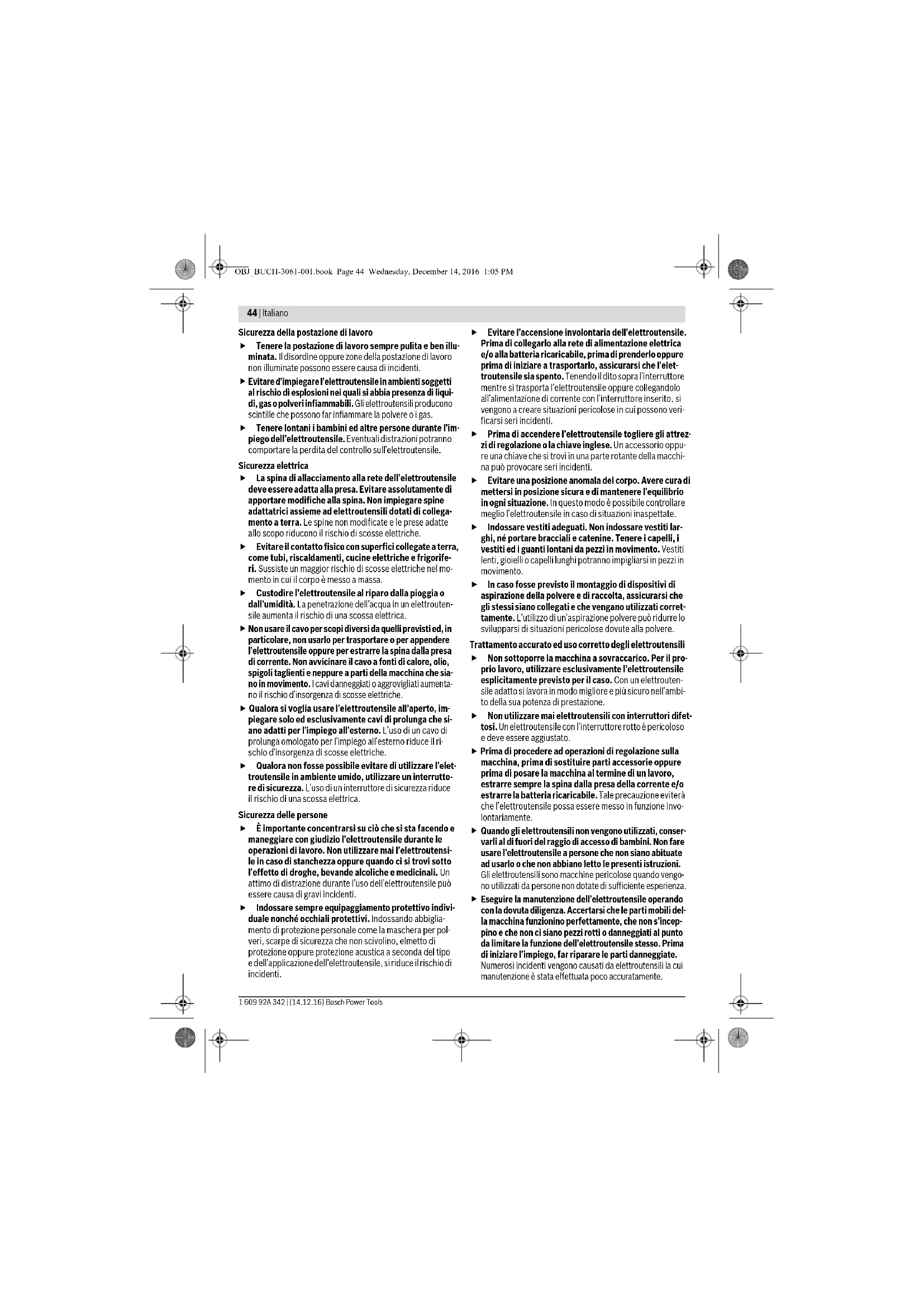 Eseguire la manutenzione dell’elettroutensile operando con la dovuta diligenza. Accertarsi che le parti mobili del- la macchina funzionino perfettamente, che non s’incep- pino e che non ci siano pezzi rotti o danneggiati al punto da limitare la funzione dell’elettroutensile stesso. Prima di iniziare l’impiego, far riparare le parti danneggiate. Numerosi incidenti vengono causati da elettroutensili la cui manutenzione è stata effettuata poco accuratamente. OBJ_BUCH-3061-001.book Page 44 Wednesday, December 14, 2016 1:05 PMItaliano | 45 Bosch Power Tools 1 609 92A 342 | (14.12.16) Mantenere gli utensili da taglio sempre affilati e puliti. Gli utensili da taglio curati con particolare attenzione e con taglienti affilati s’inceppano meno frequentemente e sono più facili da condurre. Utilizzare l’elettroutensile, gli accessori opzionali, gli utensili per applicazioni specifiche ecc., sempre atte- nendosi alle presenti istruzioni. Così facendo, tenere sempre presente le condizioni di lavoro e le operazioni da eseguire. L’impiego di elettroutensili per usi diversi da quelli consentiti potrà dar luogo a situazioni di pericolo. Assistenza Fare riparare l’elettroutensile solo ed esclusivamente da personale specializzato e solo impiegando pezzi di ricambio originali. In tale maniera potrà essere salvaguar- data la sicurezza dell’elettroutensile. Indicazioni di sicurezza per troncatrici Non appoggiarsi mai sull’elettroutensile. Possono veri- ficarsi lesioni serie se l’elettroutensile si ribalta oppure se si viene inavvertitamente a contatto con la mola da taglio. Utilizzare sempre la cuffia di protezione. Una cuffia di protezione protegge l’operatore da parti della mola da ta- glio che si staccano e dal contatto accidentale con la stes- sa. Accertarsi che la cuffia di protezione funzioni corretta- mente e che si possa muovere liberamente. Mai blocca- re la cuffia di protezione quando si trova in posizione aper- ta. Utilizzare l’elettroutensile esclusivamente per tagli a secco. La penetrazione di acqua in un elettroutensile au- menta il rischio di una scossa elettrica. Tenere il cavo di collegamento elettrico lontano dagli accessori rotanti. Il cavo elettrico potrebbe essere taglia- to oppure afferrato. Avere cura di tenere le impugnature sempre asciutte, pulite e libere da olio e grasso. Impugnature sporche di grasso e di olio sono scivolose e possono causare la perdita del controllo. Non rimuovere mai resti di taglio, trucioli metallici o al- tro dalla zona di taglio mentre l’elettroutensile è in fun- zione. Portare sempre per primo in posizione di riposo il braccio dell’utensile e spegnere l’elettroutensile. Avvicinare la mola da taglio al pezzo in lavorazione solo quando è in funzione. In caso contrario vi è il pericolo di provocare un contraccolpo se la mola da taglio si inceppa nel pezzo in lavorazione. Utilizzare esclusivamente l’elettroutensile se la super- ficie di lavoro fino al pezzo da lavorare è libera da tutti gli attrezzi di regolazione, trucioli meccanici ecc. Picco- li pezzi metallici o altri oggetti che vengono a contatto con la mola da taglio rotante possono colpire l’operatore con elevata velocità. Serrare sempre saldamente il pezzo da lavorare. Non lavorare pezzi che sono troppo piccoli per essere serra- ti saldamente. La distanza dalla mano alla mola da taglio rotante è altrimenti troppo scarsa. Qualora la mola da taglio dovesse incepparsi, spegnere l’elettroutensile ed attendere fino a quando la mola da taglio si sarà fermata. Non tentare mai di estrarre la mola da taglio in funzione dal taglio poiché potrebbe verificarsi un contraccolpo. Determinare ed eliminare la causa per il blocco. Non frenare la mola da taglio che continua a girare per inerzia dopo lo spegnimento sottoponendola a pressio- ne laterale. La mola da taglio può venire danneggiata, rot- ta oppure potrebbe causare un contraccolpo. Non cercare di far penetrare con violenza la mola da ta- glio nel pezzo in lavorazione e non esercitare una pres- sione troppo forte mentre si utilizza l’elettroutensile. Evitare in modo particolare un bloccaggio della mola da taglio durante la lavorazione su angoli, spigoli taglienti ecc. Se la mola da taglio è danneggiata per un uso non con- forme, si possono formare delle crepe che possono provo- care una rottura improvvisa della stessa. Mettere un grembiule da lavoro. Accertarsi sempre di non mettere nessuno in pericolo con la scia di scintille. Allontanare ogni tipo di materiale infiammabile che si trova nelle vicinanze. Levigando il metallo si produce una scia di scintille. Utilizzare la troncatrice esclusivamente per i materiali che sono indicati nell’uso conforme alle norme. In caso contrario la troncatrice potrebbe venire sovraccaricata. Non utilizzare mole da taglio danneggiate, non circolari oppure che vibrano. Mole da taglio danneggiate causano un elevato attrito, il bloccaggio della mola da taglio e con- traccolpo. Utilizzare sempre mole da taglio che abbiano le dimen- sioni corrette e il foro di montaggio adatto (ad es. a rombo oppure rotondo). In caso di mole da taglio inadatte agli elementi di montaggio della troncatrice, la rotazione non sarà perfettamente circolare e si crea il pericolo di una perdita di controllo. Non utilizzare seghe a catena e neppure lame dentella- te. Questo tipo di accessori provocano spesso un contrac- colpo oppure la perdita del controllo sull’elettroutensile. Osservare le istruzioni per l’uso del produttore delle mole da taglio per il montaggio e l’uso della mola da ta- glio. Mole da taglio non adatte possono causare lesioni e provocare il bloccaggio, la rottura oppure un contraccolpo. Non utilizzare nessun accessorio che la casa costruttri- ce non abbia esplicitamente previsto e raccomandato per questo elettroutensile. Il semplice fatto che un ac- cessorio possa essere fissato al Vostro elettroutensile non è una garanzia per un impiego sicuro. Dopo il lavoro non toccare la mola