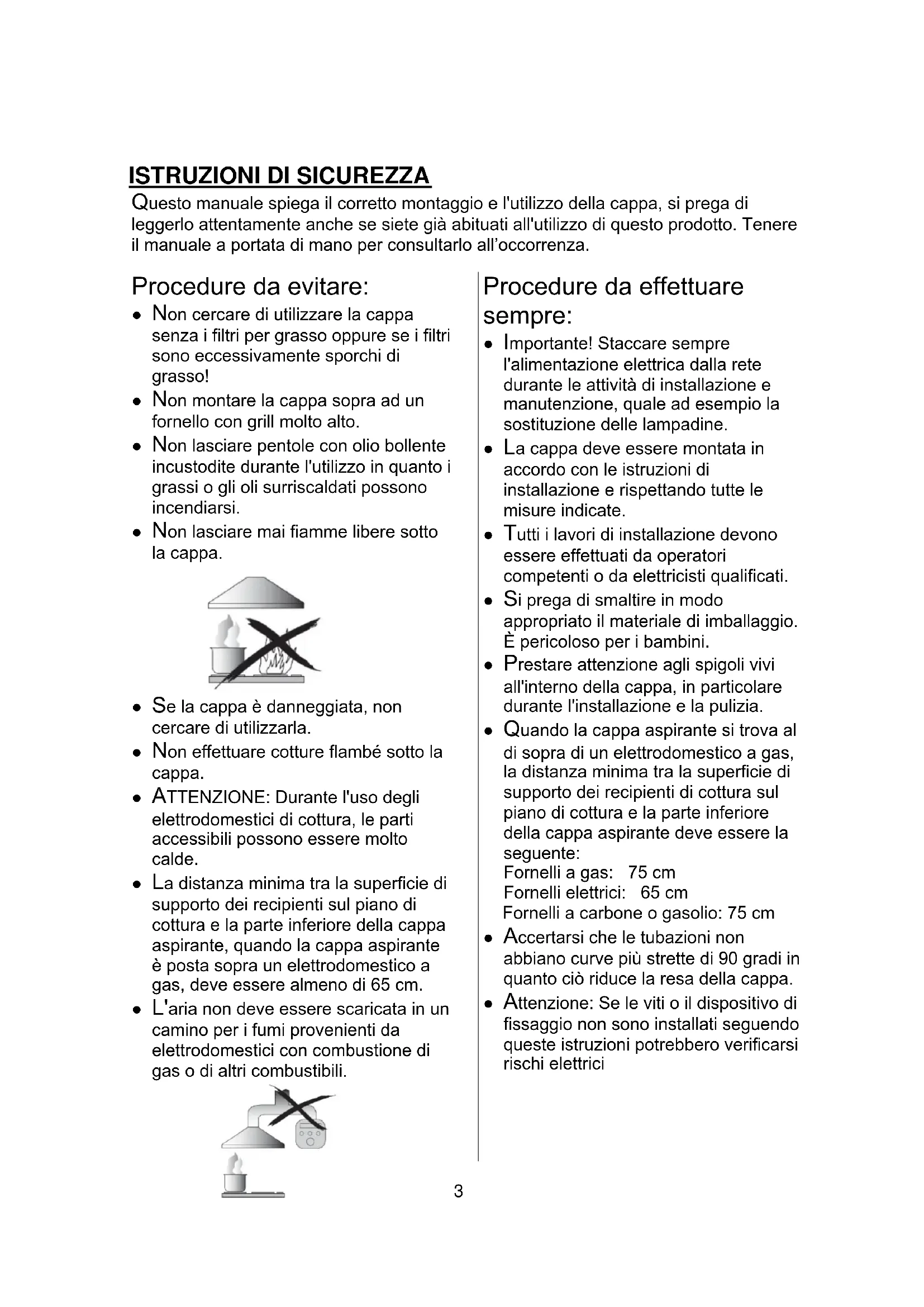 Questo manuale spiega il corretto montaggio e l'utilizzo della cappa, si prega di leggerlo attentamente anche se siete già abituati all'utilizzo di questo prodotto. Tenere il manuale a portata di mano per consultarlo all’occorrenza. Procedure da evitare: ● Non cercare di utilizzare la cappa senza i filtri per grasso oppure se i filtri sono eccessivamente sporchi di grasso! ● Non montare la cappa sopra ad un fornello con grill molto alto. ● Non lasciare pentole con olio bollente incustodite durante l'utilizzo in quanto i grassi o gli oli surriscaldati possono incendiarsi. ● Non lasciare mai fiamme libere sotto la cappa. ● Se la cappa è danneggiata, non cercare di utilizzarla. ● Non effettuare cotture flambé sotto la cappa. ● ATTENZIONE: Durante l'uso degli elettrodomestici di cottura, le parti accessibili possono essere molto calde. ● La distanza minima tra la superficie di supporto dei recipienti sul piano di cottura e la parte inferiore della cappa aspirante, quando la cappa aspirante è posta sopra un elettrodomestico a gas, deve essere almeno di 65 cm. ● L'aria non deve essere scaricata in un camino per i fumi provenienti da elettrodomestici con combustione di gas o di altri combustibili.