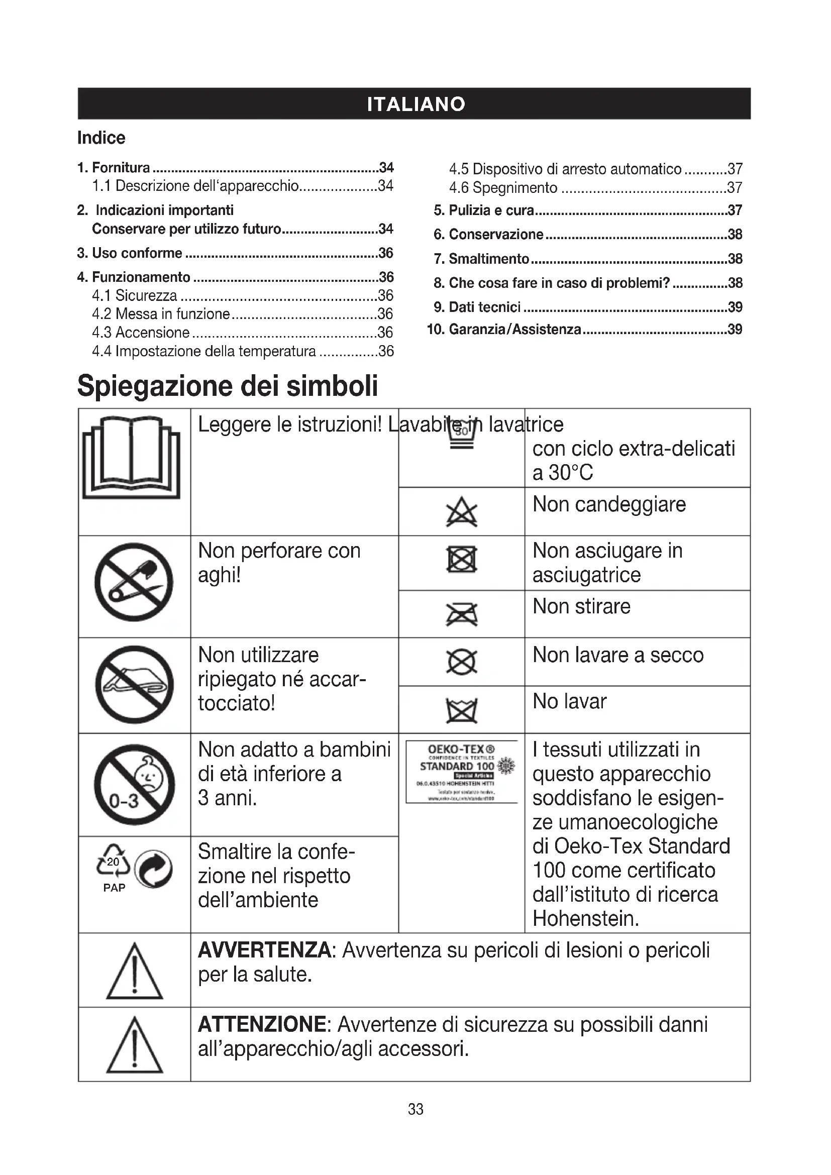 Smaltire la confe- zione nel rispetto dell’ambiente AVVERTENZA: Avvertenza su pericoli di lesioni o pericoli per la salute. ATTENZIONE: Avvertenze di sicurezza su possibili danni all’apparecchio/agli accessori.34 Nota: Indicazione di informazioni importanti.