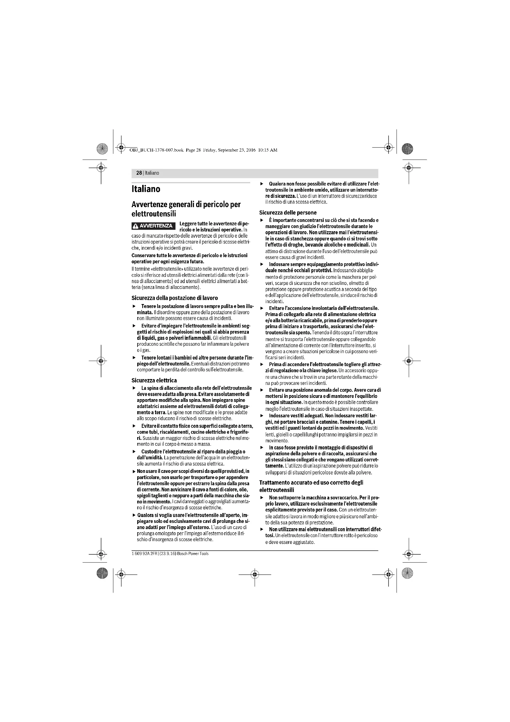Non usare il cavo per scopi diversi da quelli previsti ed, in particolare, non usarlo per trasportare o per appendere l’elettroutensile oppure per estrarre la spina dalla presa di corrente. Non avvicinare il cavo a fonti di calore, olio, spigoli taglienti e neppure a parti della macchina che sia- no in movimento. I cavi danneggiati o aggrovigliati aumenta- no il rischio d’insorgenza di scosse elettriche. Qualora si voglia usare l’elettroutensile all’aperto, im- piegare solo ed esclusivamente cavi di prolunga che si- ano adatti per l’impiego all’esterno. L’uso di un cavo di prolunga omologato per l’impiego all’esterno riduce il ri- schio d’insorgenza di scosse elettriche. Qualora non fosse possibile evitare di utilizzare l’elet- troutensile in ambiente umido, utilizzare un interrutto- re di sicurezza. L’uso di un interruttore di sicurezza riduce il rischio di una scossa elettrica. Sicurezza delle persone È importante concentrarsi su ciò che si sta facendo e maneggiare con giudizio l’elettroutensile durante le operazioni di lavoro. Non utilizzare mai l’elettroutensi- le in caso di stanchezza oppure quando ci si trovi sotto l’effetto di droghe, bevande alcoliche e medicinali. Un attimo di distrazione durante l’uso dell’elettroutensile può essere causa di gravi incidenti. Indossare sempre equipaggiamento protettivo indivi- duale nonché occhiali protettivi. Indossando abbiglia- mento di protezione personale come la maschera per pol- veri, scarpe di sicurezza che non scivolino, elmetto di protezione oppure protezione acustica a seconda del tipo e dell’applicazione dell’elettroutensile, si riduce il rischio di incidenti. Evitare l’accensione involontaria dell’elettroutensile. Prima di collegarlo alla rete di alimentazione elettrica e/o alla batteria ricaricabile, prima di prenderlo oppure prima di iniziare a trasportarlo, assicurarsi che l’elet- troutensile sia spento. Tenendo il dito sopra l’interruttore mentre si trasporta l’elettroutensile oppure collegandolo all’alimentazione di corrente con l’interruttore inserito, si vengono a creare situazioni pericolose in cui possono veri- ficarsi seri incidenti. Prima di accendere l’elettroutensile togliere gli attrez- zi di regolazione o la chiave inglese. Un accessorio oppu- re una chiave che si trovi in una parte rotante della macchi- na può provocare seri incidenti. Evitare una posizione anomala del corpo. Avere cura di mettersi in posizione sicura e di mantenere l’equilibrio in ogni situazione. In questo modo è possibile controllare meglio l’elettroutensile in caso di situazioni inaspettate. Indossare vestiti adeguati. Non indossare vestiti lar- ghi, né portare bracciali e catenine. Tenere i capelli, i vestiti ed i guanti lontani da pezzi in movimento. Vestiti lenti, gioielli o capelli lunghi potranno impigliarsi in pezzi in movimento. In caso fosse previsto il montaggio di dispositivi di aspirazione della polvere e di raccolta, assicurarsi che gli stessi siano collegati e che vengano utilizzati corret- tamente. L’utilizzo di un’aspirazione polvere può ridurre lo svilupparsi di situazioni pericolose dovute alla polvere. Trattamento accurato ed uso corretto degli elettroutensili Non sottoporre la macchina a sovraccarico. Per il pro- prio lavoro, utilizzare esclusivamente l’elettroutensile esplicitamente previsto per il caso. Con un elettrouten- sile adatto si lavora in modo migliore e più sicuro nell’ambi- to della sua potenza di prestazione. Non utilizzare mai elettroutensili con interruttori difet- tosi. Un elettroutensile con l’interruttore rotto è pericoloso e deve essere aggiustato. AVVERTENZA OBJ_BUCH-1378-007.book Page 28 Friday, September 23, 2016 10:15 AMItaliano | 29 Bosch Power Tools 1 609 92A 2FR | (23.9.16) Prima di procedere ad operazioni di regolazione sulla macchina, prima di sostituire parti accessorie oppure prima di posare la macchina al termine di un lavoro, estrarre sempre la spina dalla presa della corrente e/o estrarre la batteria ricaricabile. Tale precauzione eviterà che l’elettroutensile possa essere messo in funzione invo- lontariamente. Quando gli elettroutensili non vengono utilizzati, con- servarli al di fuori del raggio di accesso di bambini. Non fare usare l’elettroutensile a persone che non siano abi- tuate ad usarlo o che non abbiano letto le presenti istru- zioni. Gli elettroutensili sono macchine pericolose quando vengono utilizzati da persone non dotate di sufficiente esperienza. Eseguire la manutenzione dell’elettroutensile operan- do con la dovuta diligenza. Accertarsi che le parti mobi- li della macchina funzionino perfettamente, che non s’inceppino e che non ci siano pezzi rotti o danneggiati al punto da limitare la funzione dell’elettroutensile stesso. Prima di iniziare l’impiego, far riparare le parti danneggiate. Numerosi incidenti vengono causati da elet- troutensili la cui manutenzione è stata effettuata poco ac- curatamente. Mantenere gli utensili da taglio sempre affilati e puliti. Gli utensili da taglio curati con particolare attenzione e con taglienti affilati s’inceppano meno frequentemente e sono più facili da condurre. Utilizzare l’elettroutensile, gli accessori opzionali, gli utensili per applicazioni specifiche ecc., sempre atte- nendosi alle presenti istruzioni. Così facendo, tenere sempre presente le condizioni di lavoro e le operazioni da eseguire. L’impiego di elettroutensili per usi diversi da quelli consentiti potrà dar luogo a situazioni di pericolo. Trattamento ed utilizzo appropriato di utensili dotati di batterie ricaricabili Caricare la batteria ricaricabile solo ed esclusivamente nei dispositivi di carica consigliati dal produttore. Per un dispositivo di carica previsto per un determinato tipo di batteria sussiste pericolo di incendio se viene utilizzato con un tipo diverso di batteria ricaricabile. Avere cura d’impiegare negli elettroutensili solo ed esclusivamente batterie ricar
