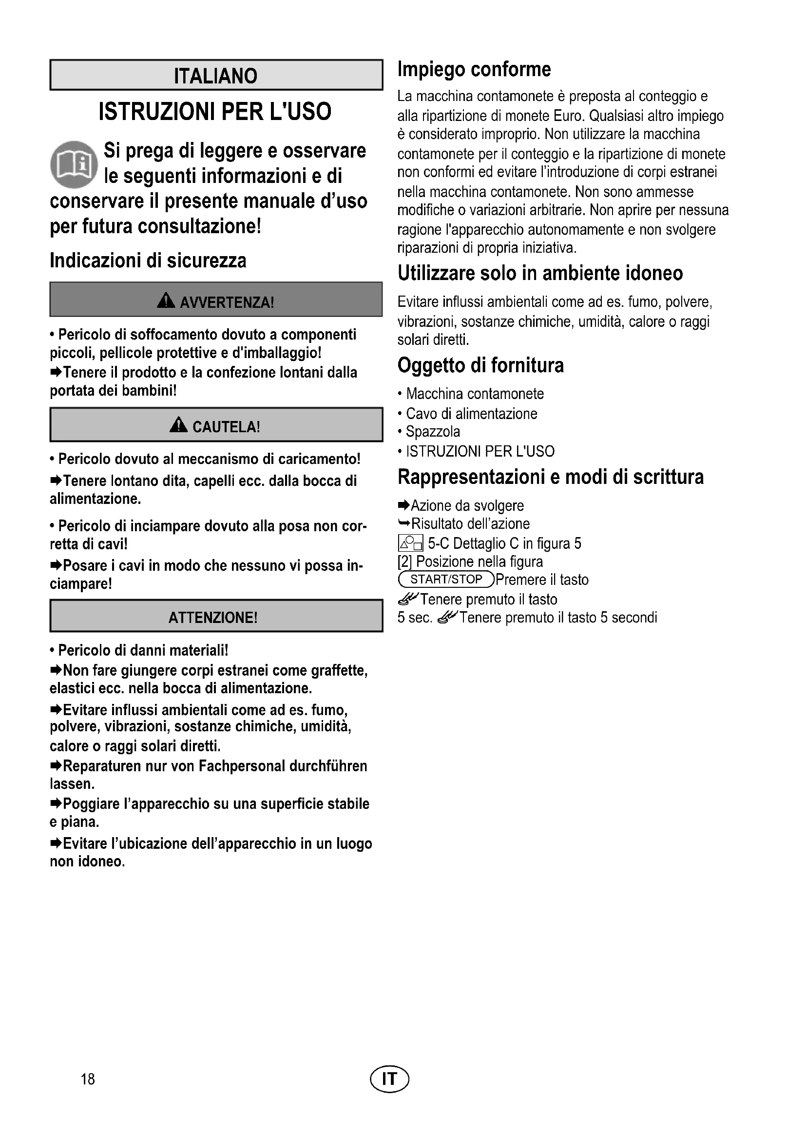 - Pericolo di danni materiali! Non fare giungere corpi estranei come graffette, elastici ecc. nella bocca di alimentazione. Evitare influssi ambientali come ad es. fumo, polvere, vibrazioni, sostanze chimiche, umidità, calore o raggi solari diretti. Reparaturen nur von Fachpersonal durchführen lassen. Poggiare l’apparecchio su una superficie stabile e piana. Evitare l’ubicazione dell’apparecchio in un luogo non idoneo. Impiego conforme La macchina contamonete è preposta al conteggio e alla ripartizione di monete Euro. Qualsiasi altro impiego è considerato improprio. Non utilizzare la macchina contamonete per il conteggio e la ripartizione di monete non conformi ed evitare l’introduzione di corpi estranei nella macchina contamonete. Non sono ammesse modifiche o variazioni arbitrarie. Non aprire per nessuna ragione l'apparecchio autonomamente e non svolgere riparazioni di propria iniziativa. Utilizzare solo in ambiente idoneo Evitare influssi ambientali come ad es. fumo, polvere, vibrazioni, sostanze chimiche, umidità, calore o raggi solari diretti. Oggetto di fornitura