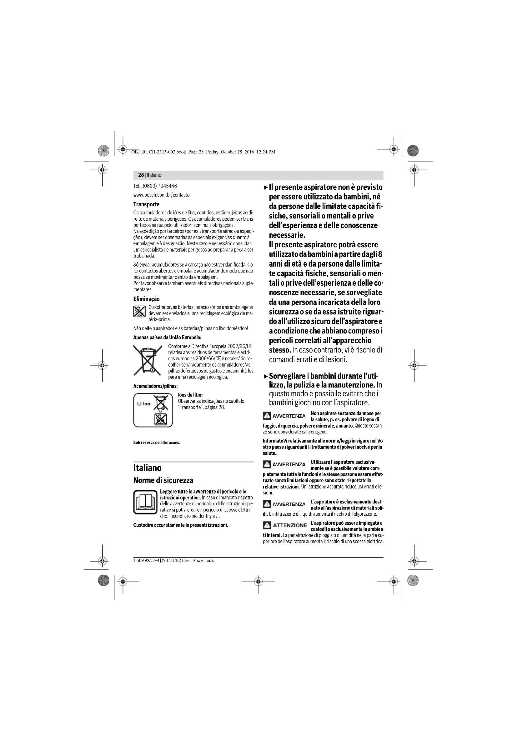 con regolarità, si garantirà la potenza di aspirazione ottimale. Se in seguito ai controlli non viene ottenuta la potenza di aspira- zione, rivolgersi al Centro di Assistenza Clienti. Assistenza clienti e consulenza impieghi Il servizio di assistenza risponde alle Vostre domande relative al- la riparazione ed alla manutenzione del Vostro prodotto nonché concernenti le parti di ricambio. Disegni in vista esplosa ed infor- mazioni relative alle parti di ricambio sono consultabili anche sul sito: www.bosch-pt.com Il team Bosch che si occupa della consulenza impieghi vi aiuterà in caso di domande relative ai nostri prodotti ed ai loro accesso- ri. In caso di richieste o di ordinazione di pezzi di ricambio, comuni- care sempre il codice prodotto a 10 cifre riportato sulla targhet- ta di fabbricazione del prodotto. Italia Officina Elettroutensili Robert Bosch S.p.A. Corso Europa, ang. Via Trieste 20 20020 LAINATE (MI) Tel.: (02) 3696 2663 Fax: (02) 3696 2662 Fax: (02) 3696 8677 E-Mail: officina.elettroutensili@it.bosch.com Svizzera Sul sito www.bosch-pt.com/ch/it è possible ordinare diretta- mente on-line i ricambi. Tel.: (044) 8471513 Fax: (044) 8471553 E-Mail: Aftersales.Service@de.bosch.com Trasporto Le batterie ricaricabili agli ioni di litio contenute sono soggette ai requisiti di legge relativi a merci pericolose. Le batterie ricarica- bili possono essere trasportate su strada tramite l’utente senza ulteriori precauzioni. In caso di spedizione tramite terzi (es.: trasporto aereo oppure spedizioniere) devono essere osservati particolari requisiti rela- tivi ad imballo e marcatura. In questo caso per la preparazione del pezzo da spedire è necessario ricorrere ad un esperto per merce pericolosa. Spedire batterie ricaricabili solamente se la carcassa non è dan- neggiata. Coprire con nastro adesivo i contatti scoperti ed imbal- lare la batteria ricaricabile in modo tale che non si muova nell’im- ballo. Vi preghiamo di osservare anche eventuali ulteriori norme nazio- nali. Smaltimento Smaltire nel rispetto dell’ambiente aspiratore, batterie, accessori e imballaggi. Non gettare l’aspiratore, né le batterie o le pile, tra i rifiuti dome- stici. Solo per i Paesi della CE: Conformemente alla direttiva europea 2012/19/CE gli aspiratori diventati inservibi- li e, in base alla direttiva europea 2006/66/CE, le batterie ricaricabili/batterie difettose o consumate devono essere raccol- te separatamente ed essere inviate ad una ri- utilizzazione ecologica. Per le batterie ricaricabili/le batterie non funzionanti rivolgersi al Consorzio: Italia Ecoelit Viale Misurata 32 20146 Milano Tel.: +39 02 / 4 23 68 63 Fax: +39 02 / 48 95 18 93 Svizzera Batrec AG 3752 Wimmis BE Batterie ricaricabili/Batterie: Li-Ion: Si prega di tener presente le indicazioni riportare nel paragrafo «Trasporto», pagina 32. Con ogni riserva di modifiche tecniche. Nederlands Veiligheidsvoorschriften Lees alle veiligheidswaarschuwingen en alle voorschriften. Als de waarschuwingen en voor- schriften niet worden opgevolgd, kan dit een elek- trische schok, brand of ernstig letsel tot gevolg hebben. Bewaar deze voorschriften goed.