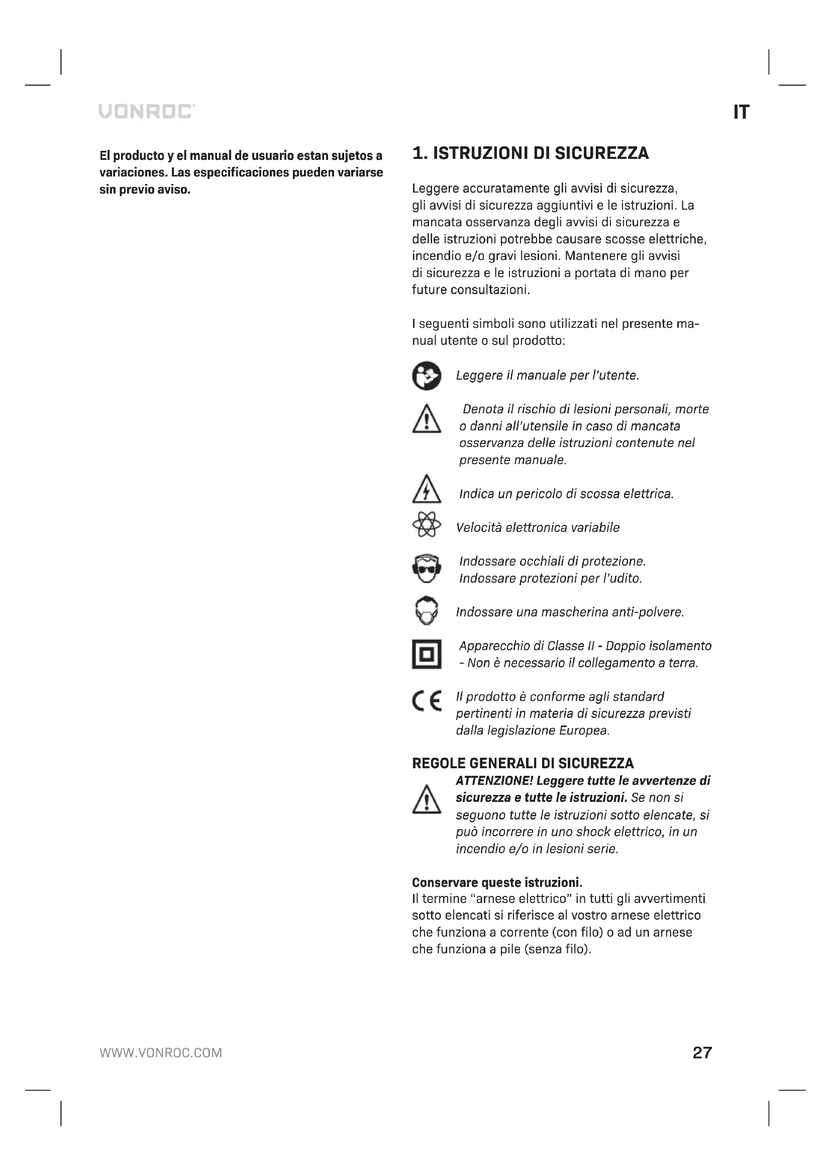 - Sono state utilizzate parti di ricambio non origi- nali Cio costituisce l’unica garanzia espressa o implicita fornita dall’azienda. Non esistono altre garanzie es- presse o implicite che si estendono oltre il presente documento, ivi comprese le garanzie implicite di commerciabilita e idoneita per uno scopo particola- re. In nessun caso VONROC sara responsabile di eventuali danni incidentali o consequenziali. I rime- di dei rivenditori saranno limitati alla riparazione o sostituzione di unita o parti non conformi. Il prodotto e il manuale per l’utente sono soggetti a modifiche. I dati tecnici possono essere modificati senza ulteriore notifica.32