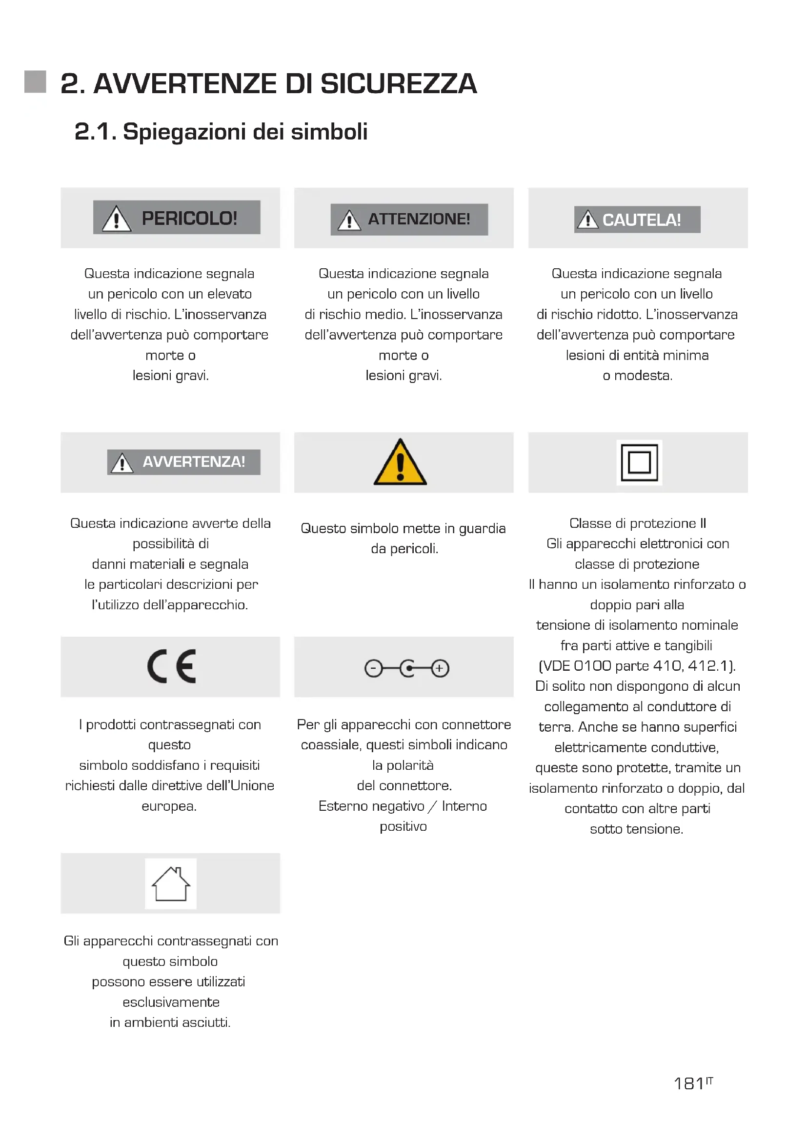 Questa indicazione segnalaun pericolo con un elevatolivello di rischio. L’inosservanzadell’avvertenza può comportare morte olesioni gravi.Questa indicazione avverte della possibilità didanni materiali e segnalale particolari descrizioni perl’utilizzo dell’apparecchio.Questa indicazione segnalaun pericolo con un livellodi rischio medio. L’inosservanzadell’avvertenza può comportare morte olesioni gravi.Questo simbolo mette in guardia da pericoli.Questa indicazione segnalaun pericolo con un livellodi rischio ridotto. L’inosservanzadell’avvertenza può comportare lesioni di entità minimao modesta.Classe di protezione IIGli apparecchi elettronici con classe di protezioneII hanno un isolamento rinforzato odoppio pari alla tensione di isolamento nominalefra parti attive e tangibili(VDE 0100 parte 410, 412.1). Di solito non dispongono di alcun collegamento al conduttore di terra. Anche se hanno superfici elettricamente conduttive, queste sono protette, tramite un isolamento rinforzato o doppio, dal contatto con altre partisotto tensione. 2.1. Spiegazioni dei simboli I prodotti contrassegnati con questosimbolo soddisfano i requisitirichiesti dalle direttive dell’Unioneeuropea.Per gli apparecchi con connettore coassiale, questi simboli indicano la polaritàdel connettore.Esterno negativo / Interno positivoGli apparecchi contrassegnati con questo simbolopossono essere utilizzati esclusivamentein ambienti asciutti.182