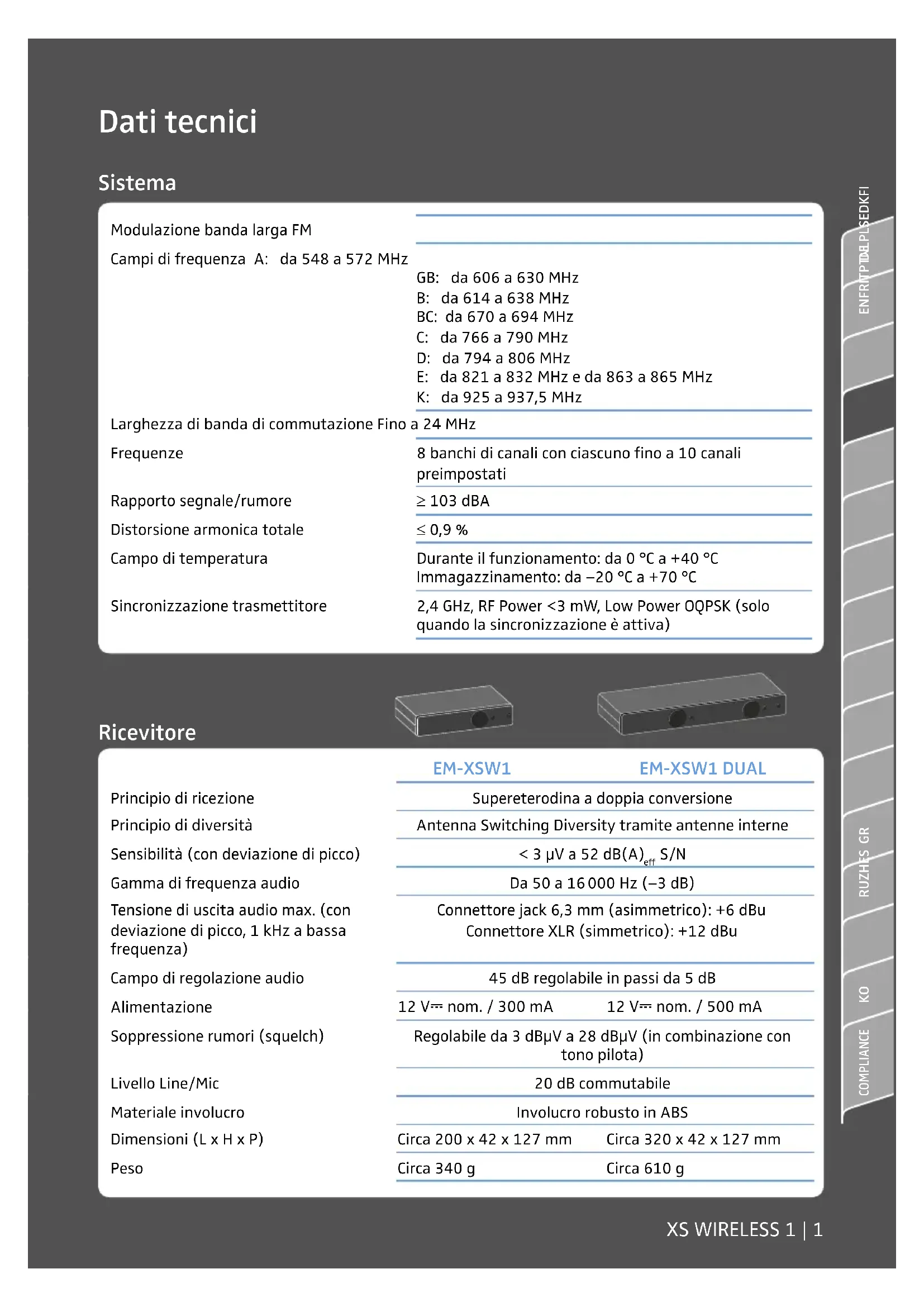 COMPLIANCE Dati tecnici Modulazione banda larga FM Campi di frequenza A: da 548 a 572 MHz GB: da 606 a 630 MHz B: da 614 a 638 MHz BC: da 670 a 694 MHz C: da 766 a 790 MHz D: da 794 a 806 MHz E: da 821 a 832 MHz e da 863 a 865 MHz K: da 925 a 937,5 MHz Larghezza di banda di commutazione Fino a 24 MHz Frequenze 8 banchi di canali con ciascuno fino a 10 canali preimpostati Rapporto segnale/rumore ≥ 103 dBA Distorsione armonica totale ≤ 0,9 % Campo di temperatura Durante il funzionamento: da 0 °C a +40 °C Immagazzinamento: da –20 °C a +70 °C Sincronizzazione trasmettitore 2,4 GHz, RF Power <3 mW, Low Power OQPSK (solo quando la sincro nizzazione è attiva) Sistema