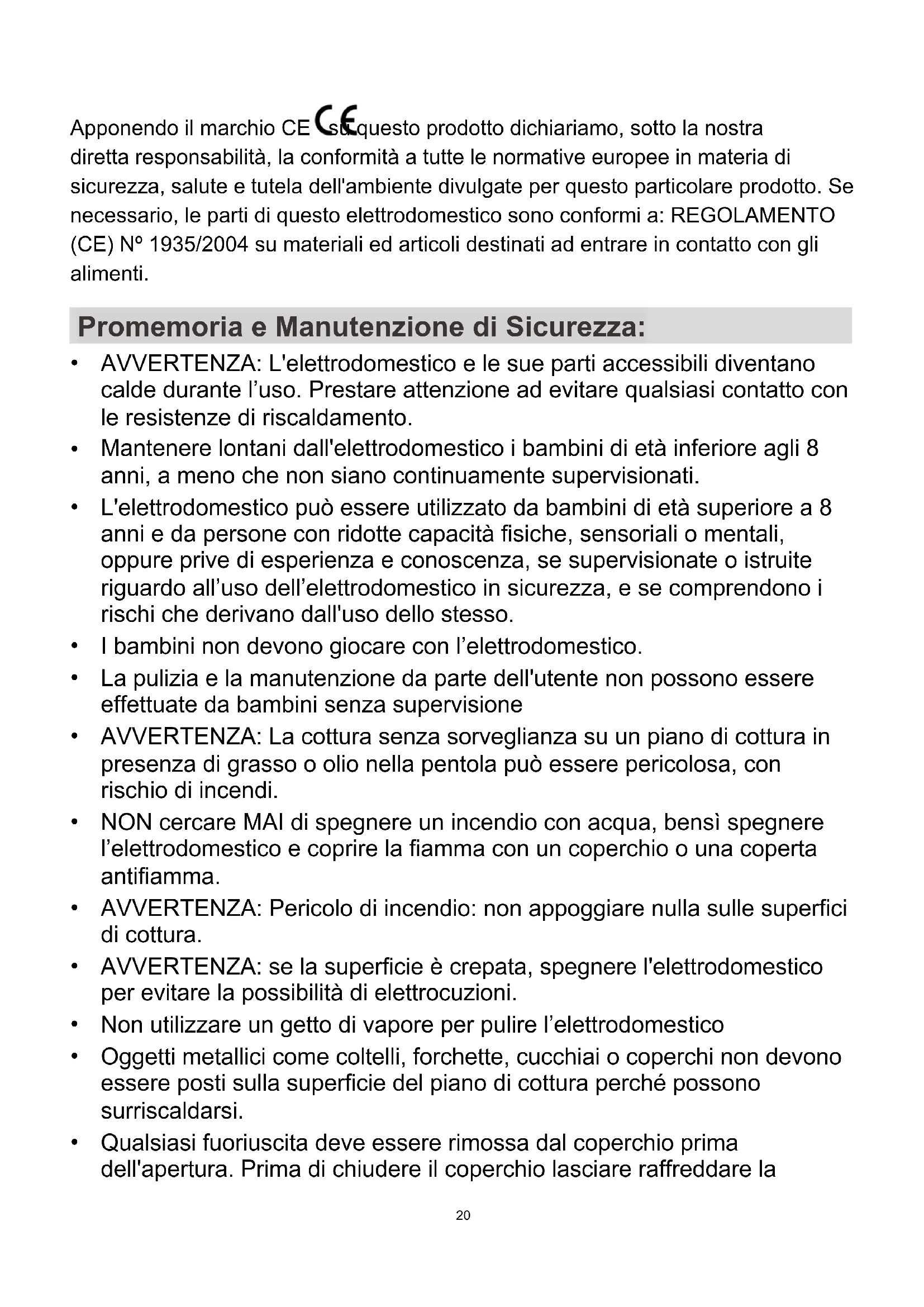 Apponendo il marchio CE su questo prodotto dichiariamo, sotto la nostra diretta responsabilità, la conformità a tutte le normative europee in materia di sicurezza, salute e tutela dell'ambiente divulgate per questo particolare prodotto. Se necessario, le parti di questo elettrodomestico sono conformi a: REGOLAMENTO (CE) Nº 1935/2004 su materiali ed articoli destinati ad entrare in contatto con gli alimenti. Promemoria e Manutenzione di Sicurezza: