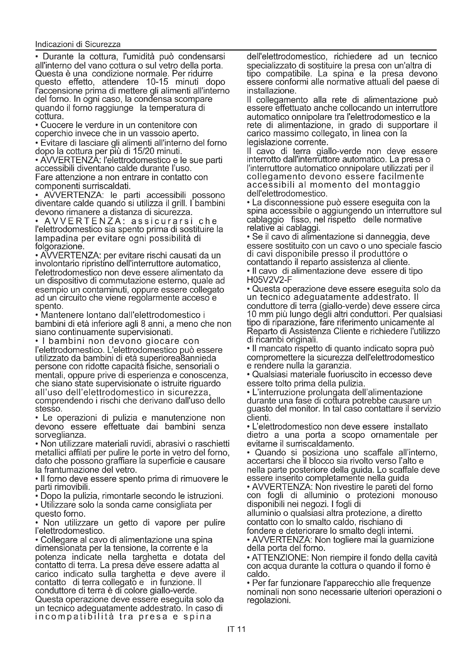 UN’ELETTRICISTAO TECNICO QUALIFICATO. Il forno viene fornito con un cavo di alimentazione che deve essere collegato solo a una rete elettrica con una tensione di 220-240 VCAtra le fasi o tra la fase e il neutro. Prima di collegare il forno alla rete elettrica, è indispensabile controllare: Il filo di messa a terra collegato al morsetto di terra del forno deve essere collegato al morsetto di terra della rete elettrica. ATTENZIONE Prima di collegare il forno alla rete elettrica, far controllare la continuità della messa a terra della rete elettrica ad un elettricista qualificato. Il produttore declina ogni responsabilità per eventuali incidenti o altri problemi derivanti dal mancato collegamento a terra del forno o dal suo collegamento ad una messa a terra con una continuità difettosa. - la tensione di alimentazione indicata sul misuratore; NOTA: poiché il forno potrebbe richiedere interventi di assistenza, è consigliabile prevedere la disponibilità di un’ulteriore presa a muro a cui collegare il forno dopo che è stato rimosso dallo spazio in cui è stato installato. Il cavo di alimentazione deve essere sostituito solo dal personale dell’assistenza tecnica o da tecnici con qualifiche analoghe.