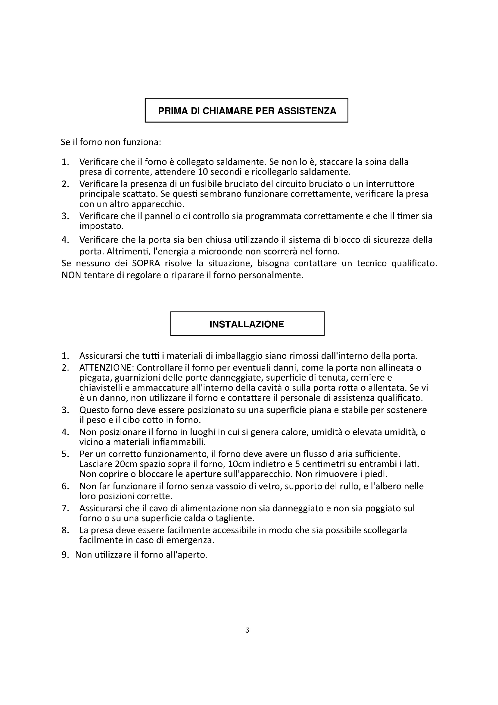 3. Questo forno deve essere posizionato su una superficie piana e stabile per sostenere