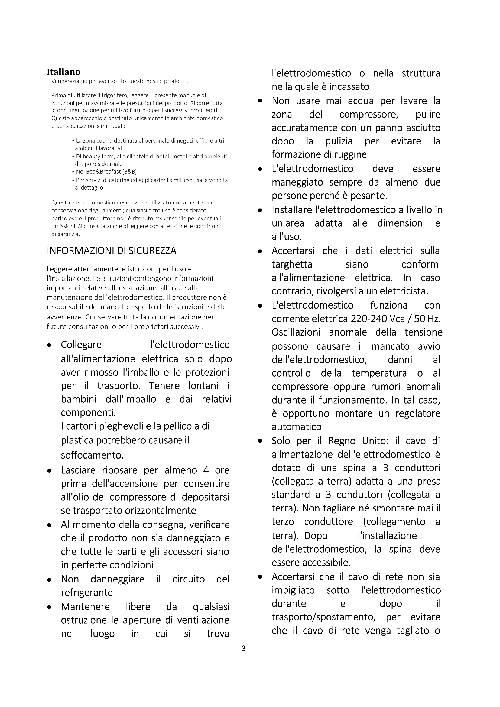 AVVERTENZA: PRIMA DI PULIRE L'ELETTRODOMESTICO, SCOLLEGARLO DALLA RETE ELETTRICA. o Non versare o spruzzare acqua sull'elettrodomestico per pulirlo. o Pulire regolarmente il congelatore con una soluzione di bicarbonato di sodio sciolto in acqua tiepida. o Pulire gli accessori separatamente con acqua e sapone. Non lavare gli accessori in lavastoviglie. o Non adoperare prodotti, saponi o detersivi abrasivi. o Dopo il lavaggio dell'elettrodomestico, strofinare la zona pulita con un panno morbido e asciugarla perfettamente. o Al termine della pulizia, asciugare le mani e ricollegare la spina alla rete elettrica. Sbrinamento del vano congelatore Rimuovere periodicamente la brina dal vano congelatore. Adoperare il raschietto in plastica per ridurre la quantità di brina accumulata. IMPORTANTE: sbrinare il congelatore almeno due volte all'anno. La frequenza dipende dall'impostazione del termostato e dalla quantità di alimenti conservati nel congelatore. ○ Il giorno prima di sbrinare l'elettrodomestico, ruotare la manopola del termostato nella posizione <5> per accertarsi che gli alimenti riposti nel congelatore siano completamente congelati. ○ Per sbrinare l'elettrodomestico, togliere gli alimenti dal congelatore, avvolgerli in vari strati di carta e collocarli in un luogo fresco. L'aumento della temperatura degli alimenti ne riduce i tempi di conservazione, per cui è opportuno consumarli entro un periodo di tempo relativamente breve. NON RICOLLOCARE GLI ALIMENTI NEL CONGELATORE DOPO L'AVVIO DELLO SBRINAMENTO. ○ Impostare la manopola del termostato nella posizione <0> e scollegare l'elettrodomestico dalla rete elettrica. ○ Lasciare aperto lo sportello del congelatore. Collocare una bacinella d'acqua calda nel congelatore per accelerare lo sbrinamento. ○ Rimuovere con una spugna l'acqua di sbrinamento che scorre nella parte inferiore del congelatore. IMPORTANTE: collocare alcuni asciugamani sul pavimento davanti all'elettrodomestico per contenere l'acqua di sbrinamento che fuoriesce dal congelatore. ○ Una volta sciolto tutto il ghiaccio accumulato, asciugare perfettamente la parte interna del congelatore per evitare che il ghiaccio si riformi immediatamente quando l'elettrodomestico viene riacceso. ○ Con le mani asciutte, ricollegare l'elettrodomestico alla rete elettrica. Impostare la manopola del termostato nella posizione <5> per 24 ore prima di ripristinare l'impostazione normale <3>. ○ Attendere 24 ore prima di riporre alimenti freschi nel congelatore. Non sbrinare l'elettrodomestico con altri apparecchi elettrici (ad es. asciugacapelli). Non usare oggetti metallici affilati per togliere il ghiaccio dal congelatore, altrimenti l'impianto refrigerante potrebbe danneggiarsi. INSTALLAZIONE IMPORTANTE: prima dell'installazione e dell'uso, leggere attentamente le istruzioni e accertarsi che la tensione (V) e la frequenza (Hz) indicate sulla targhetta corrispondano a quelle della rete domestica. La targhetta è collocata sul bordo anteriore sinistro della parte interna del frigorifero. Il produttore declina ogni responsabilità in caso di inosservanza delle norme di prevenzione degli incidenti che regolano l'utilizzo e il funzionamento dell'impianto elettrico. Collegamento elettrico