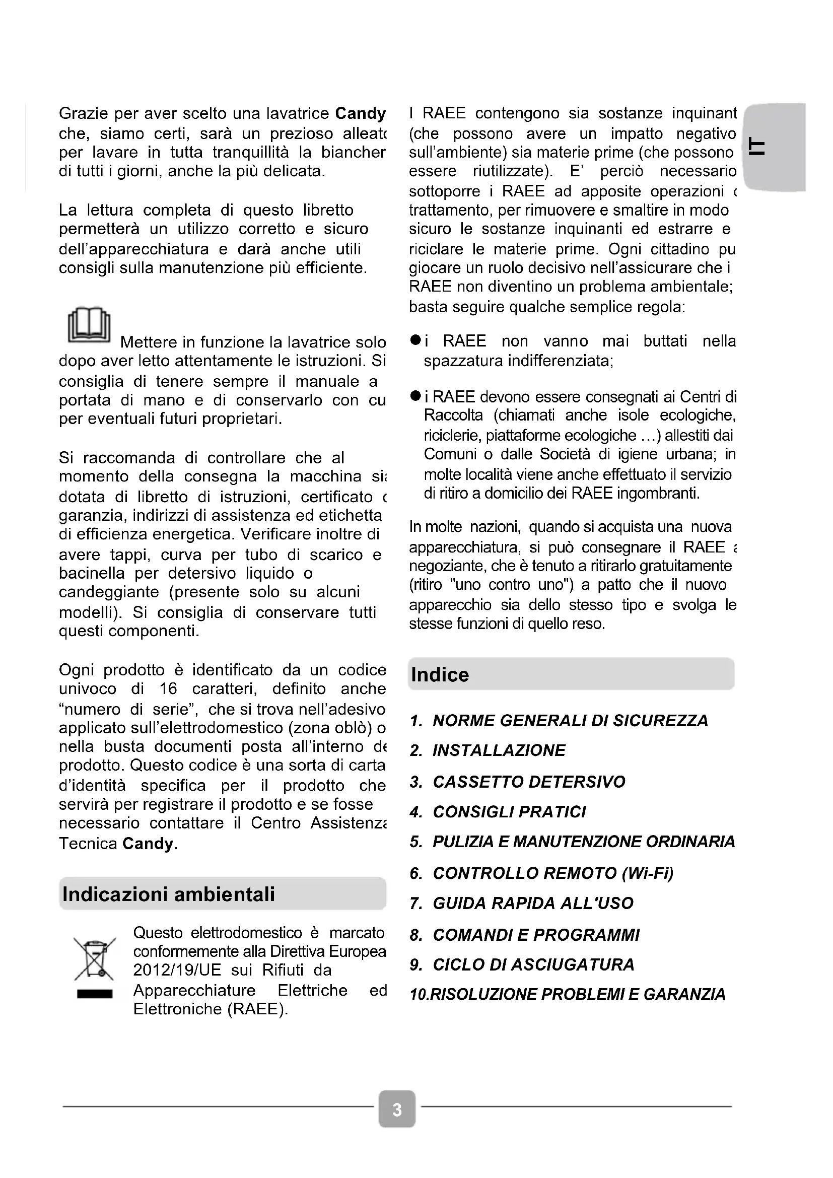 Grazie per aver scelto una lavatrice Candy che, siamo certi, sarà un prezioso alleato per lavare in tutta tranquillità la biancheria di tutti i giorni, anche la più delicata. La lettura completa di questo libretto permetterà un utilizzo corretto e sicuro dell’apparecchiatura e darà anche utili consigli sulla manutenzione più efficiente. Mettere in funzione la lavatrice solo dopo aver letto attentamente le istruzioni. Si consiglia di tenere sempre il manuale a portata di mano e di conservarlo con cura per eventuali futuri proprietari. Si raccomanda di controllare che al momento della consegna la macchina sia dotata di libretto di istruzioni, certificato di garanzia, indirizzi di assistenza ed etichetta di efficienza energetica. Verificare inoltre di avere tappi, curva per tubo di scarico e bacinella per detersivo liquido o candeggiante (presente solo su alcuni modelli). Si consiglia di conservare tutti questi componenti. Ogni prodotto è identificato da un codice univoco di 16 caratteri, definito anche “numero di serie”, che si trova nell’adesivo applicato sull’elettrodomestico (zona oblò) o nella busta documenti posta all’interno del prodotto. Questo codice è una sorta di carta d’identità specifica per il prodotto che servirà per registrare il prodotto e se fosse necessario contattare il Centro Assistenza Tecnica Candy.
