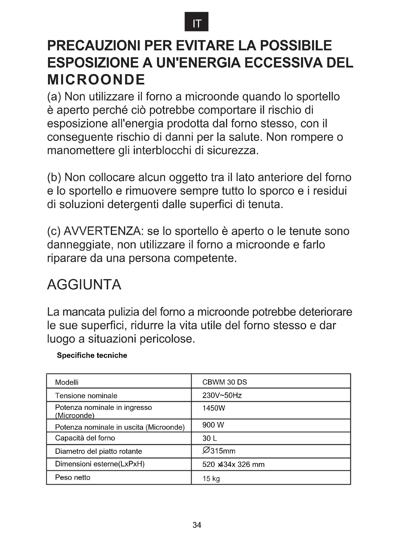 (a) Non utilizzare il forno a microonde quando lo sportello è aperto perché ciò potrebbe comportare il rischio di esposizione all'energia prodotta dal forno stesso, con il conseguente rischio di danni per la salute. Non rompere o manomettere gli interblocchi di sicurezza. (b) Non collocare alcun oggetto tra il lato anteriore del forno e lo sportello e rimuovere sempre tutto lo sporco e i residui di soluzioni detergenti dalle superfici di tenuta. (c) AVVERTENZA: se lo sportello è aperto o le tenute sono danneggiate, non utilizzare il forno a microonde e farlo riparare da una persona competente. AGGIUNTA La mancata pulizia del forno a microonde potrebbe deteriorare le sue superfici, ridurre la vita utile del forno stesso e dar luogo a situazioni pericolose.