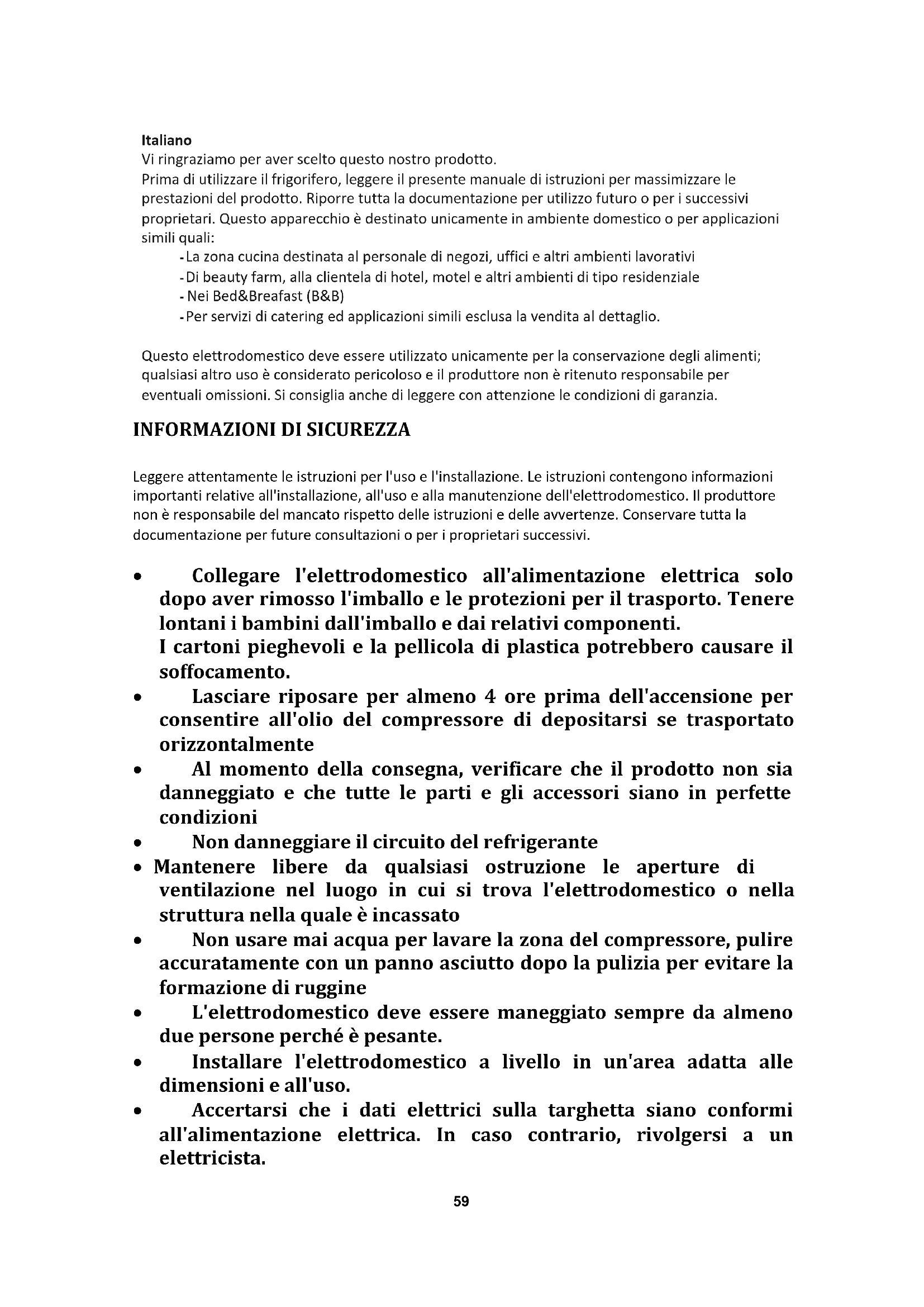 Pour plus d'informations sur le produit, veuillez consulter https://eprel.ec.europa.eu/ ou scannez le QR sur l'étiquette énergétique fournie avec l'appareil59 Italiano Vi ringraziamo per aver scelto questo nostro prodotto. Prima di utilizzare il frigorifero, leggere il presente manuale di istruzioni per massimizzare le prestazioni del prodotto. Riporre tutta la documentazione per utilizzo futuro o per i successivi proprietari. Questo apparecchio è destinato unicamente in ambiente domestico o per applicazioni simili quali: - La zona cucina destinata al personale di negozi, uffici e altri ambienti lavorativi - Di beauty farm, alla clientela di hotel, motel e altri ambienti di tipo residenziale - Nei Bed&Breafast (B&B) - Per servizi di catering ed applicazioni simili esclusa la vendita al dettaglio. Questo elettrodomestico deve essere utilizzato unicamente per la conservazione degli alimenti; qualsiasi altro uso è considerato pericoloso e il produttore non è ritenuto responsabile per eventuali omissioni. Si consiglia anche di leggere con attenzione le condizioni di garanzia.