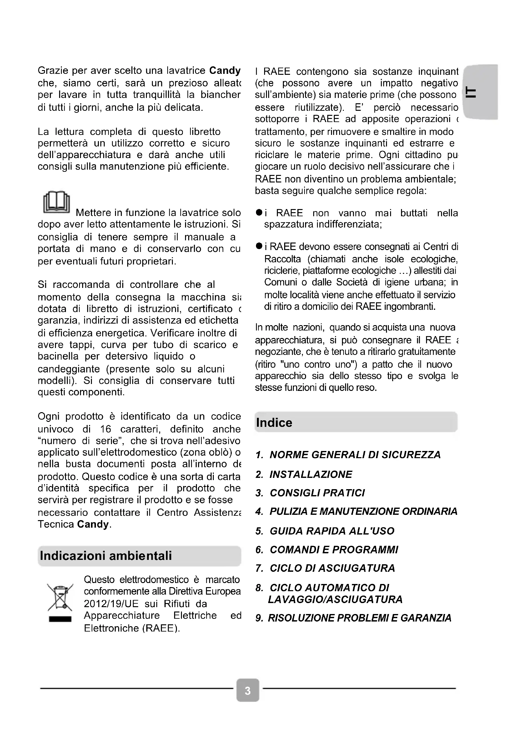 Grazie per aver scelto una lavatrice Candy che, siamo certi, sarà un prezioso alleato per lavare in tutta tranquillità la biancheria di tutti i giorni, anche la più delicata. La lettura completa di questo libretto permetterà un utilizzo corretto e sicuro dell’apparecchiatura e darà anche utili consigli sulla manutenzione più efficiente. Mettere in funzione la lavatrice solo dopo aver letto attentamente le istruzioni. Si consiglia di tenere sempre il manuale a portata di mano e di conservarlo con cura per eventuali futuri proprietari. Si raccomanda di controllare che al momento della consegna la macchina sia dotata di libretto di istruzioni, certificato di garanzia, indirizzi di assistenza ed etichetta di efficienza energetica. Verificare inoltre di avere tappi, curva per tubo di scarico e bacinella per detersivo liquido o candeggiante (presente solo su alcuni modelli). Si consiglia di conservare tutti questi componenti. Ogni prodotto è identificato da un codice univoco di 16 caratteri, definito anche “numero di serie”, che si trova nell’adesivo applicato sull’elettrodomestico (zona oblò) o nella busta documenti posta all’interno del prodotto. Questo codice è una sorta di carta d’identità specifica per il prodotto che servirà per registrare il prodotto e se fosse necessario contattare il Centro Assistenza Tecnica Candy.