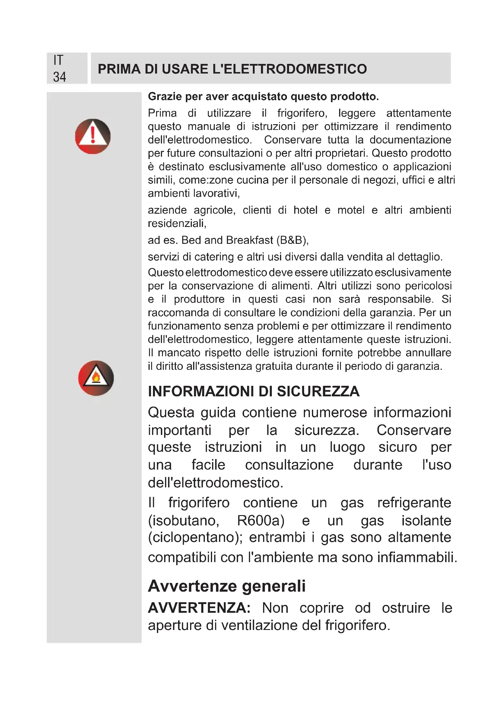 Questa guida contiene numerose informazioni importanti per la sicurezza. Conservare queste istruzioni in un luogo sicuro per una facile consultazione durante l'uso dell'elettrodomestico. Il frigorifero contiene un gas refrigerante (isobutano, R600a) e un gas isolante (ciclopentano); entrambi i gas sono altamente compatibili con l'ambiente ma sono inammabili. Avvertenze generali AVVERTENZA: Non coprire od ostruire le aperture di ventilazione del frigorifero.