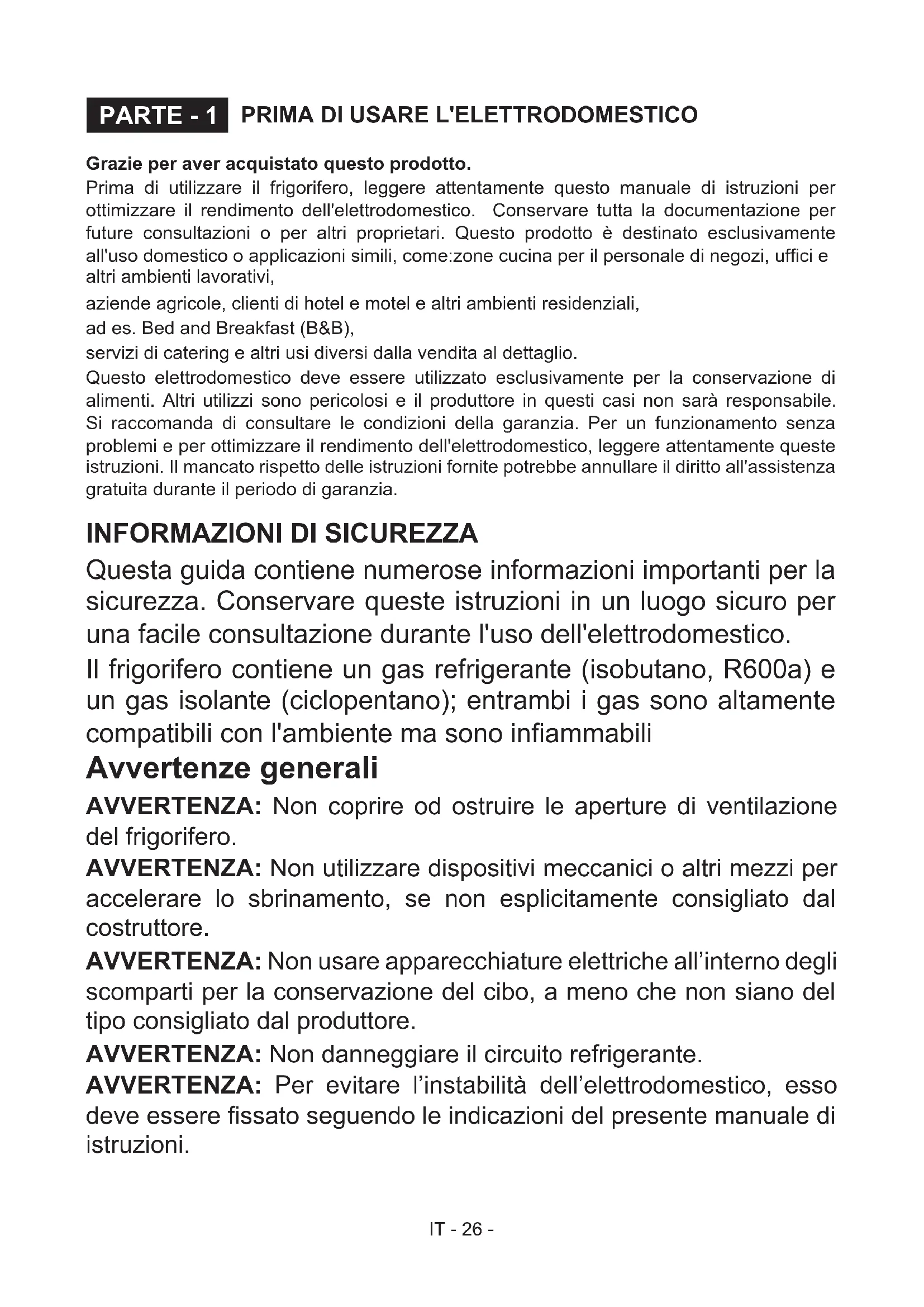 - Questo elettrodomestico è stato prodotto per un uso domestico, ed è adatto unicamente per raffreddare/conservare alimenti. Non è adatto per usi commerciali o di altro tipo e/o per conservare sostanze diverse dal cibo- La nostra azienda non è responsabile di eventuali perdite che si potrebbero vericare in caso contrario. Avvertenze di sicurezza